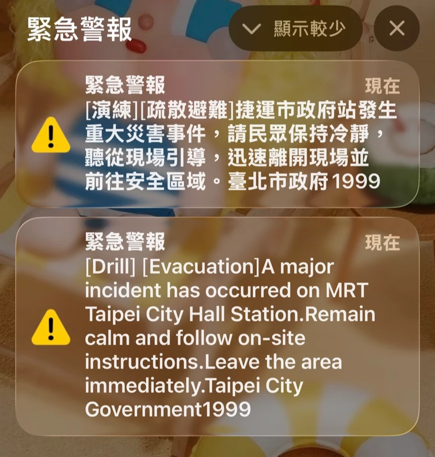 而北市府今也同步測試細胞簡訊發送,蔣萬安表示,這是在提出申請與備查後,第一次實際操作,非常順利,大家都收到細胞簡訊;另外,對於透過行控中心功能,捷運公司也告知,旅客資訊防護系統即時針對突發事件,讓民眾瞭解掌握,即時因應。