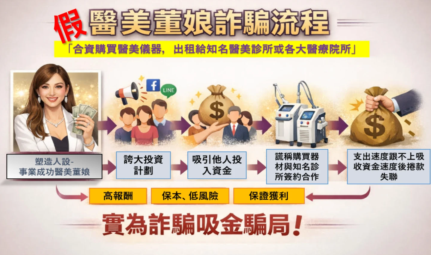 警方指出,35歲巧姓女子對外積極塑造「事業成功醫美女企業家」形象,宣稱自己經營美體美容公司,並誆稱已與多家知名醫美診所或大型醫療院所簽訂醫美儀器租賃合約,包括「鳳凰電波」、「增肌減脂儀」及「達文西手臂」等高價設備,招攬投資人合資購買儀器出租,保證每月穩定收取租金,合約到期後可取回本金,另有額外獎金。