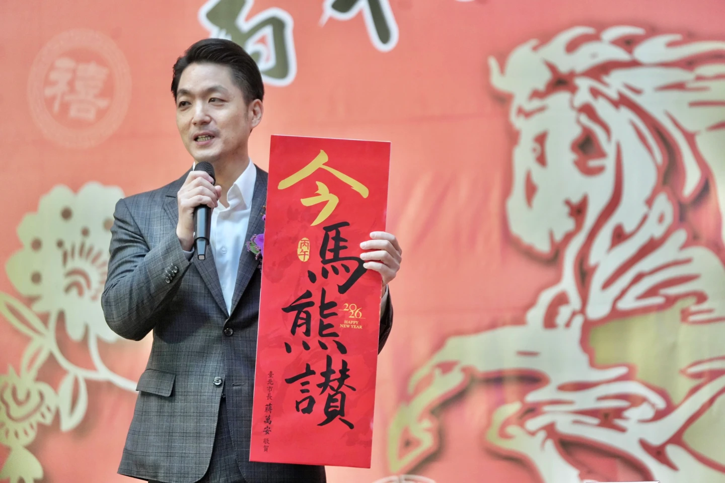 蔣萬安表示,今年找來台北市吉祥物「熊讚Bravo」,結合馬年與熊讚,取台語諧音為「今嘛上讚」,就是「今馬熊讚」,今年的春聯字體同樣是他親筆書寫的,用手寫的祝福,希望市民新的一年,每個當下都是最美好的時刻。