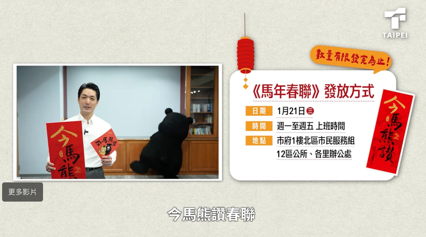 【記者許皓婷/台北報導】即將迎接農曆馬年!台北市政府搶先釋出新年祝福,台北市長蔣萬安今(15)日公開2026年馬年春聯,主題以台語諧音結合台北市吉祥物「熊讚」,推出「今馬熊讚」春聯,以及馬年限定著色斗方;台北市政府表示,1月21日起開放索取,於上班時段可前往市府大樓1樓北區市民服務組、全市12區公所及各里辦公處領取,數量有限,送完為止。