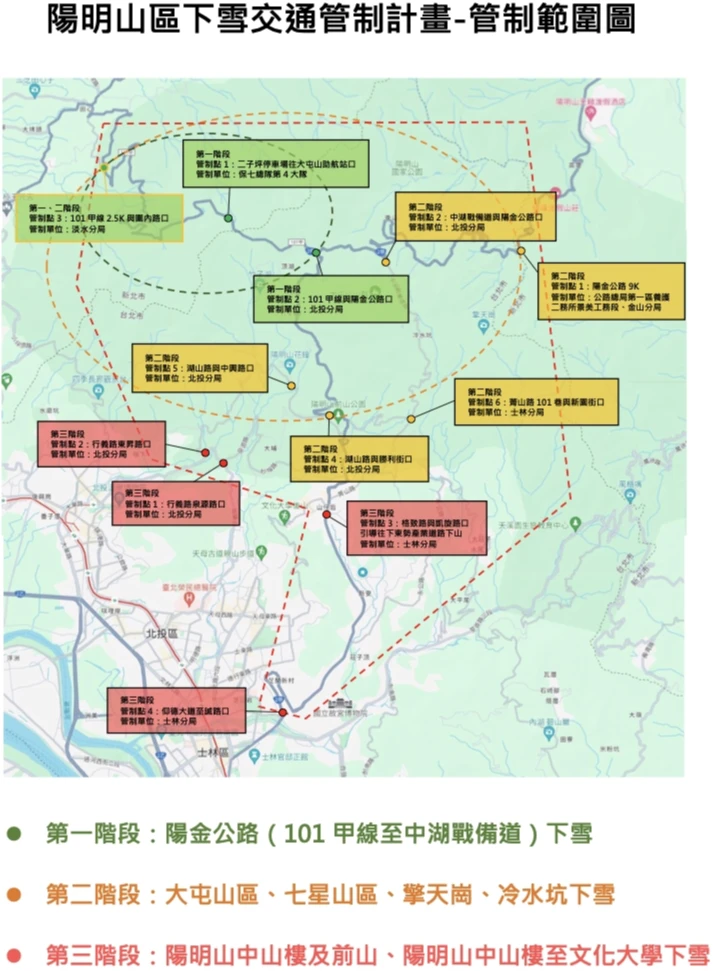 根據臺北市政府規劃的「陽明山區下雪交通管制計畫」,管制措施共分為三個階段,若雪線持續下降,管制範圍將隨之擴大:
