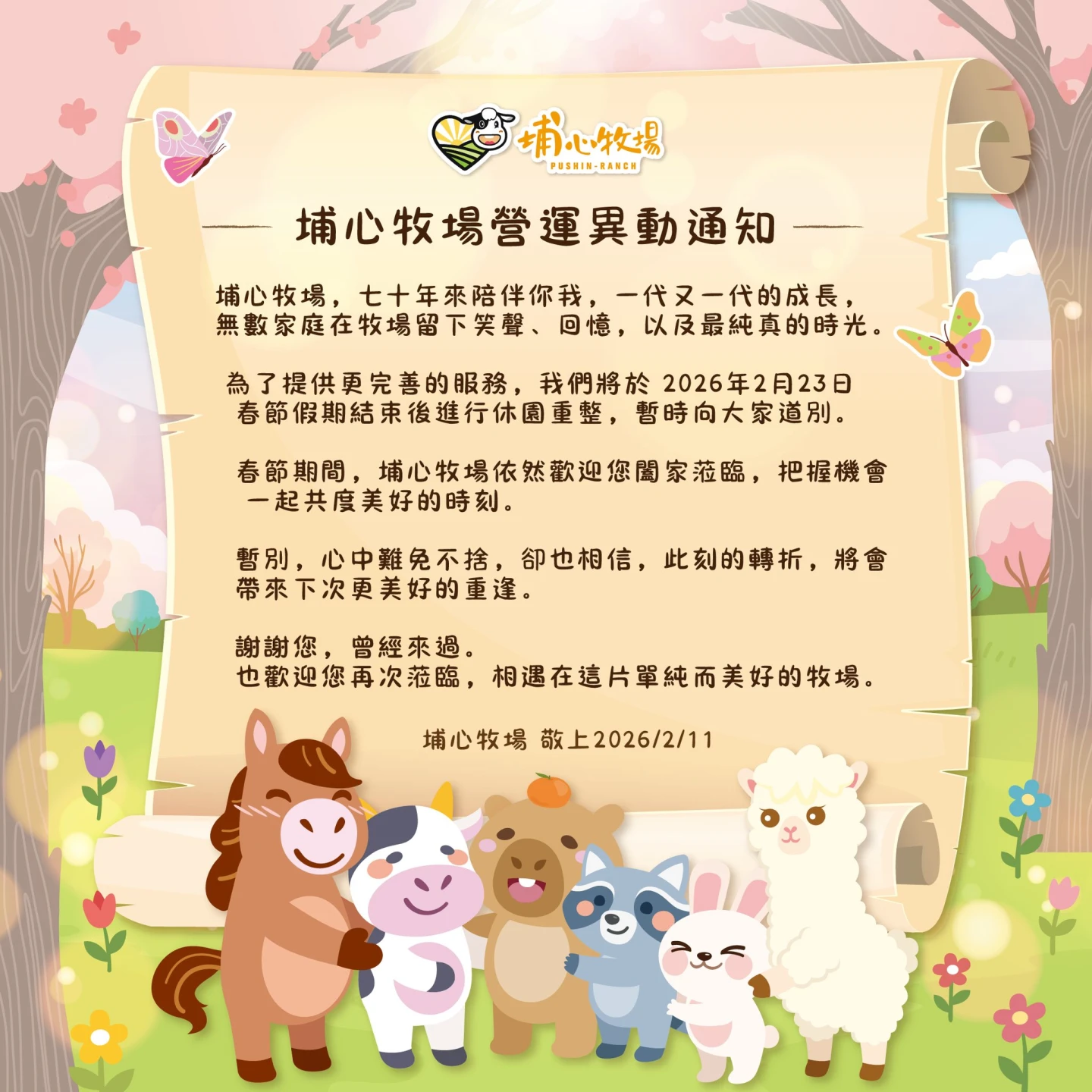 埔心牧場在社群公告,為了提供更完善的服務,將於 2026 年 2 月 23 日春節假期結束後進行休園重整,暫時向大家道別。