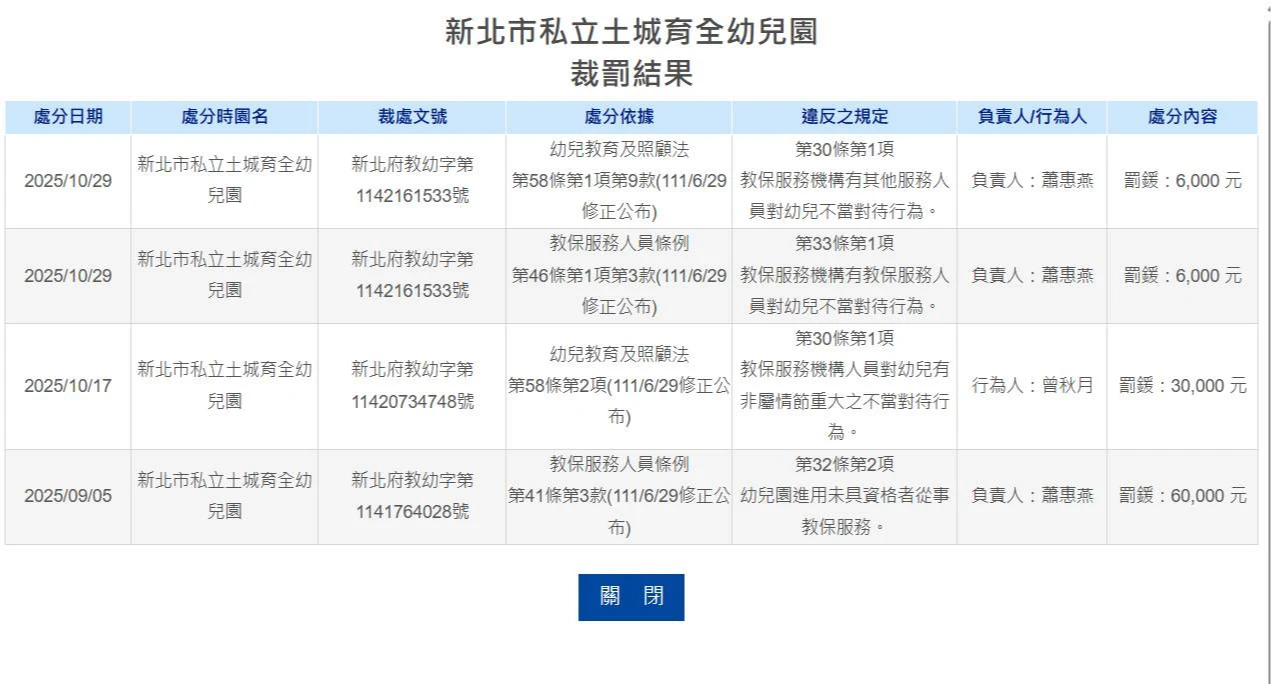 林月琴指控,裁罰金額與傷害程度失衡,無法嚇阻,曾老師在4天內就發生50次不當對待行為,光是其中一天就超過10次,甚至有幼生被強壓在地上的暴行,此等高頻率不當對待,顯示情節重大,最終卻僅以3萬元裁罰結案;新北教育局更表示因為老師不具教保資格,所以無法裁處將其納入不適任資料庫,恐致後續繼續流竄至其他學校。處分結果與對幼童造成的傷害根本不成比例,罰鍰變成可吸收的經營成本。