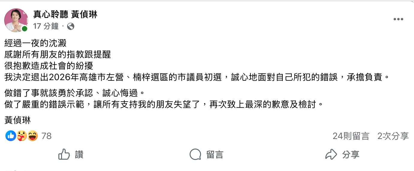 黃偵琳上午10時25分在臉書發文表示,經過一夜的沉澱,感謝所有朋友的指教跟提醒,很抱歉造成社會的紛擾,「我決定退出2026年高雄市左營、楠梓選區的市議員初選,誠心地面對自己所犯的錯誤,承擔負責。做錯了事就該勇於承認、誠心悔過。做了嚴重的錯誤示範,讓所有支持我的朋友失望了,再次致上最深的歉意及檢討。」