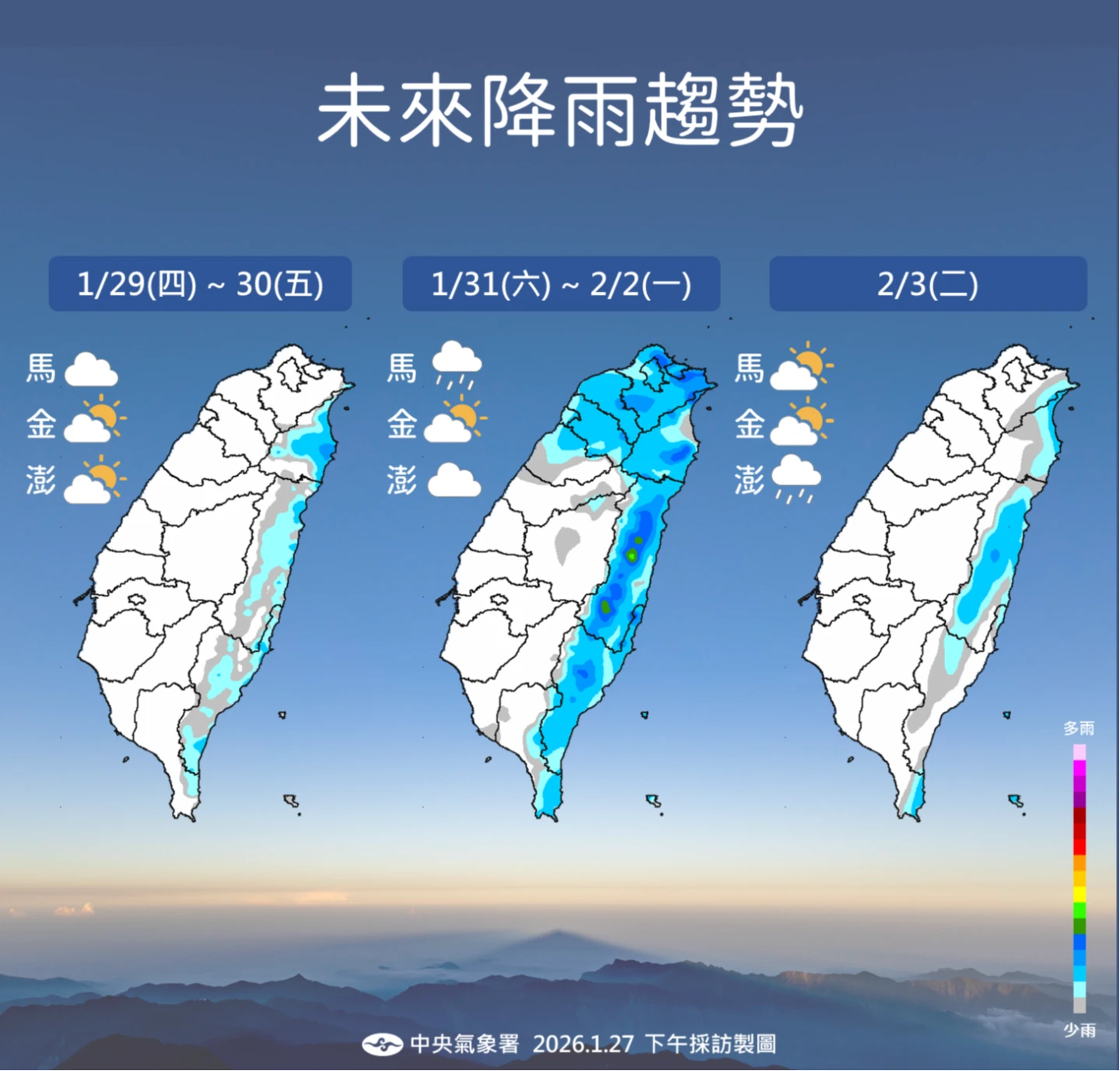好天氣到周六(31日)白天,下半天起將有鋒面通過,緊接著東北季風再度增強。周六晚間至下周日(2月1日),北台灣天氣將再度轉涼並伴隨降雨。這波水氣預計影響至下周一(2月2日),屆時北部及東半部地區有局部短暫雨,中部山區也有零星降雨機率,直到下周二(2月3日)水氣才會逐漸減少。