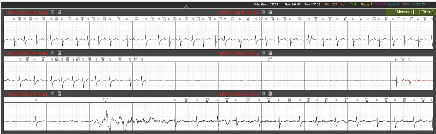 振興醫院心臟團隊指出,心律不整具有發作不規律的特性,傳統短時間的監測往往容易產生漏網之魚。為了打破僵局,醫師安排了長達7天的連續性心電圖監測,終於在海量的數據中,捕捉到患者多次心跳暫停的關鍵瞬間。