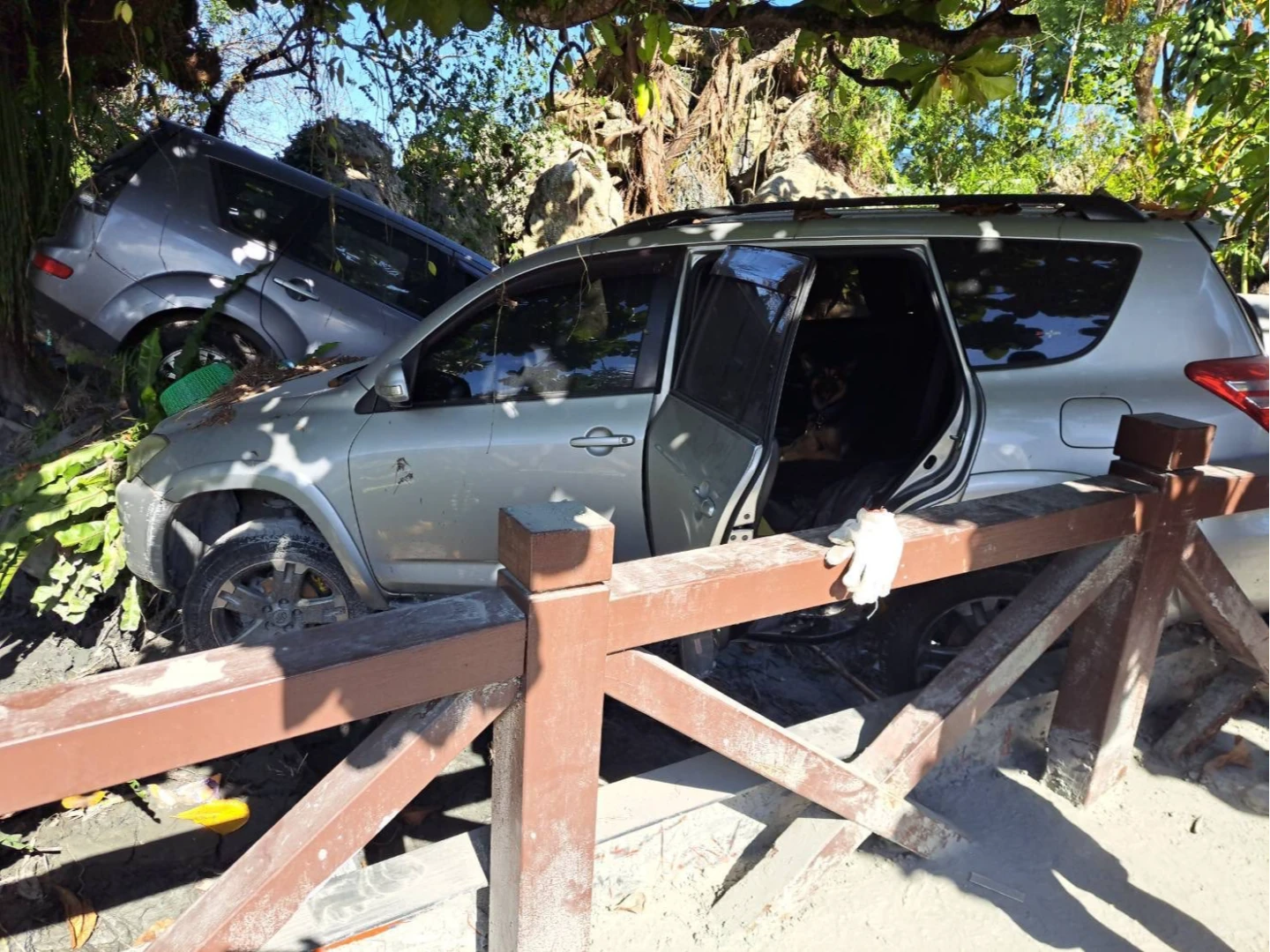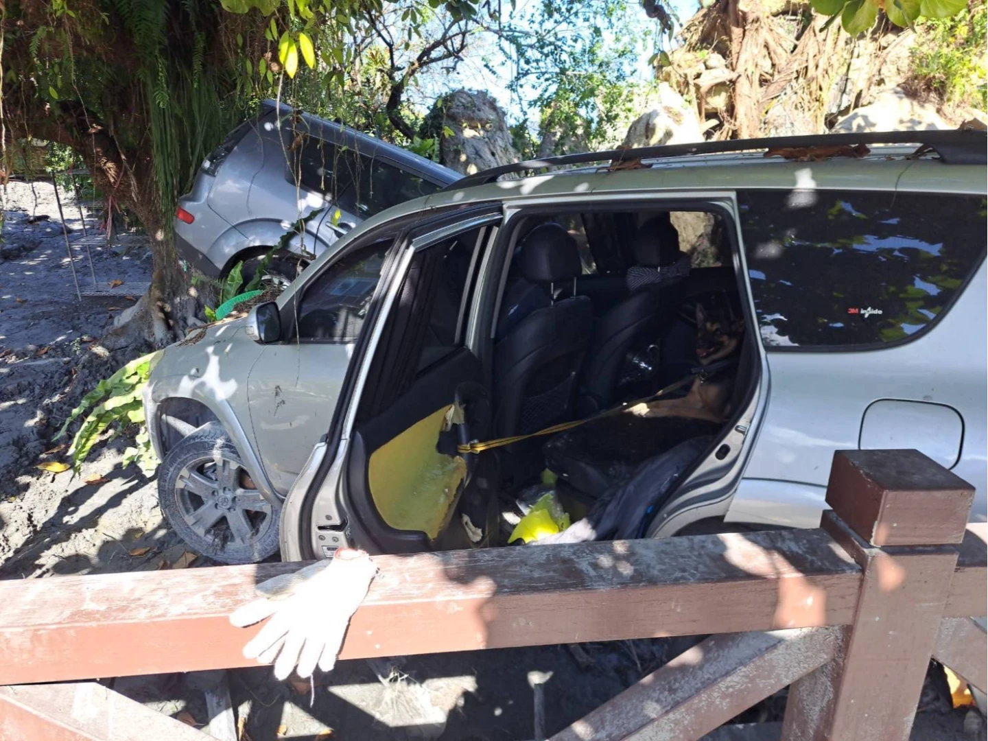 校長陳志威表示,學生在民宿旁,發現一輛被洪水沖走卡在樹下的休旅車,車體受損、窗戶受到劇烈撞擊已破裂,學生靠近在後座發現竟綁著一條黑狗。