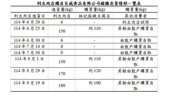 百威食品有限公司於屏東縣從事豬腸加工作業多年,新北市設有倉儲及產品流向各縣市,因公司登記於台北市,北市衛生局勒令百威公司停業。寧夏市場陳先生自6月起陸續向百威公司購買豬腸674公斤,衛生局釐清,陳先生是「利太肉店」代表人,每月分批送貨予林記麻辣豆腐店約100至120公斤,總計440公斤,其餘234公斤售予不特定市場散客。