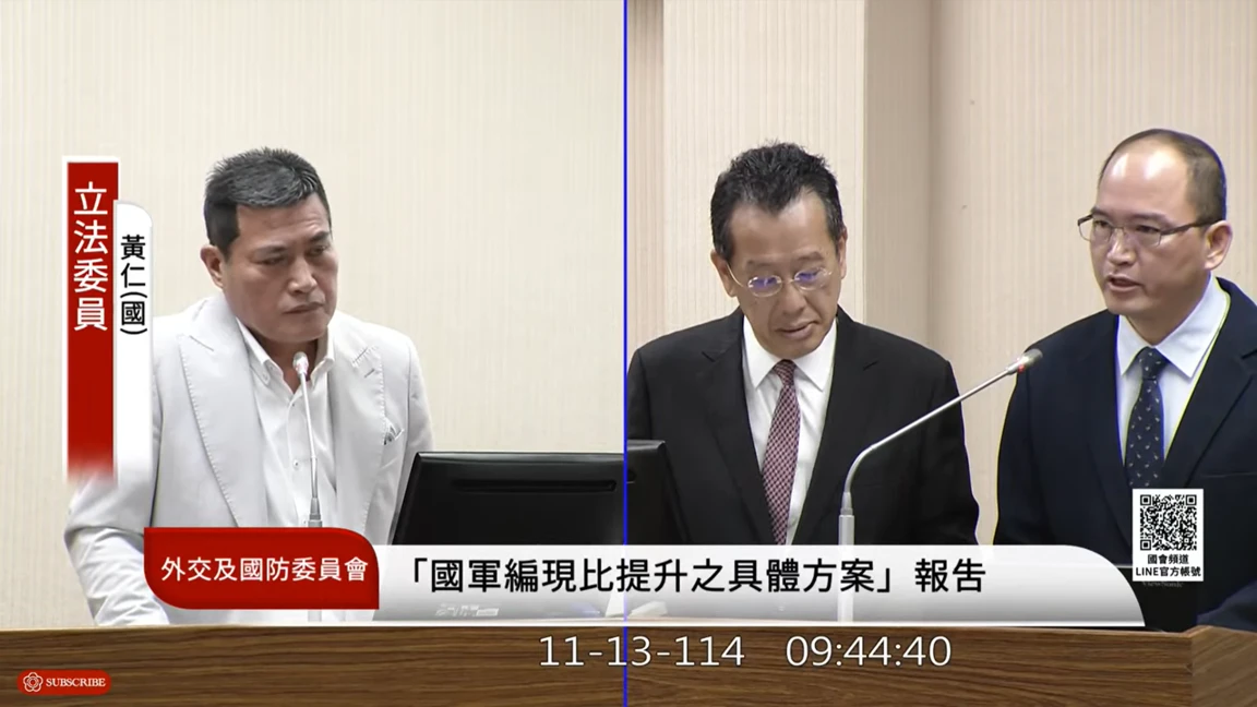 顧立雄則二度解釋,一年期義務役從2024開始,所以義務役加入2024年編現比一部份,3月份的統計就含一年期義務役,黃仁則二度質疑,提升2.3%,但你們最新資料是79.2%,顧立雄則再度解釋,所以3月分統計也有義務役,黃仁則數度喊「有含嗎?」顧立雄則略顯無奈的說「有含阿」。