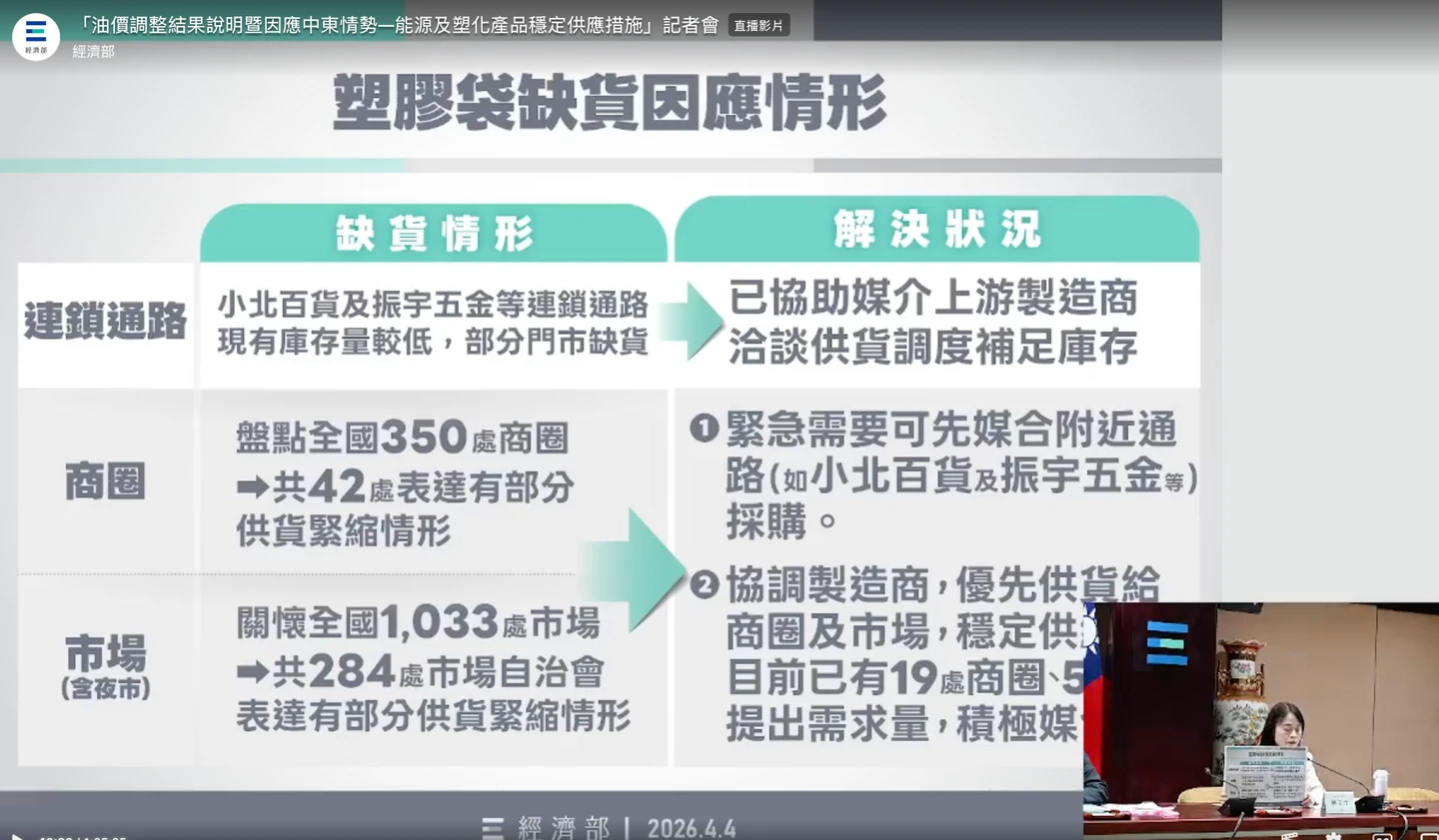在民生消費端,商業署長蘇文玲指出,目前提供小店家與攤商塑膠袋的主要通路為「小北百貨」與「振宇五金」等生活百貨。經盤點發現,這些大型連鎖通路的庫存水位較低,部分門市甚至出現缺貨狀況。對此,商業署已積極協助通路商與上游廠商進行對接洽談,確保盡快補足貨源,讓門市庫存恢復充足,以保障民生採買不受影響。