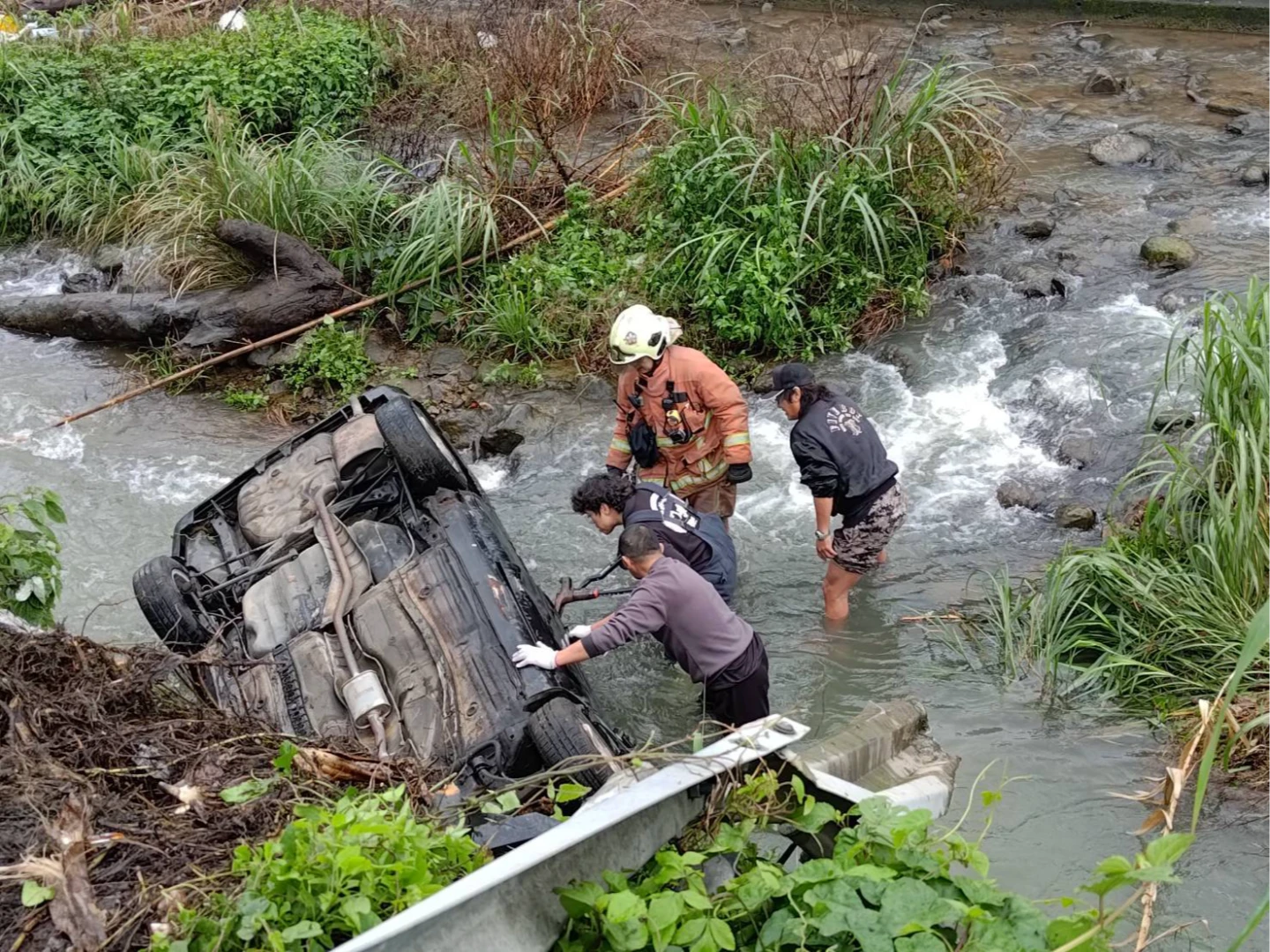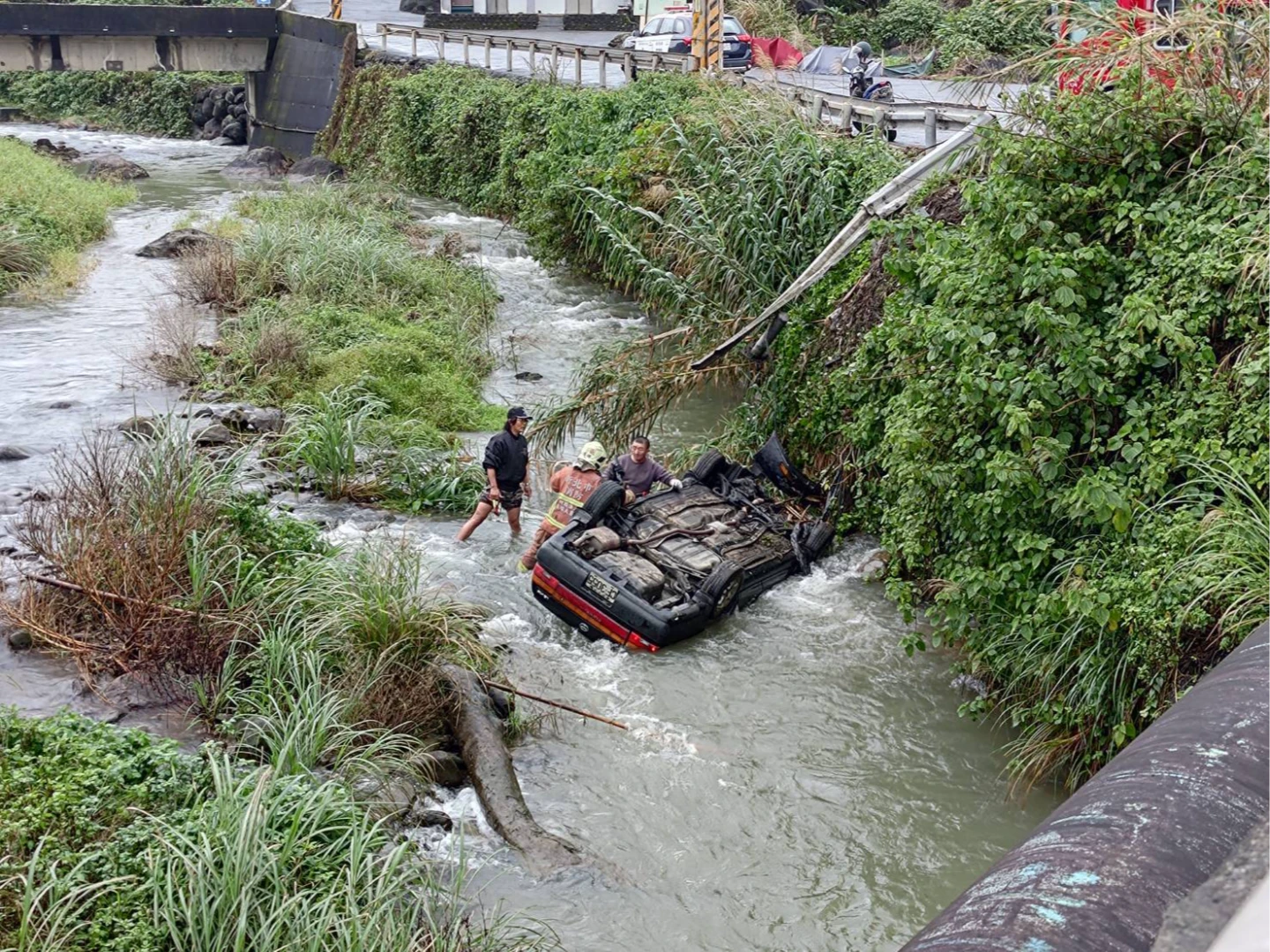 據悉,案發地點位在轉彎處,報案民眾稱看到有車墜谷,而且整輛車四輪朝天,看到駕駛座有人受困,但無法打開車門,水深約半個車身高。