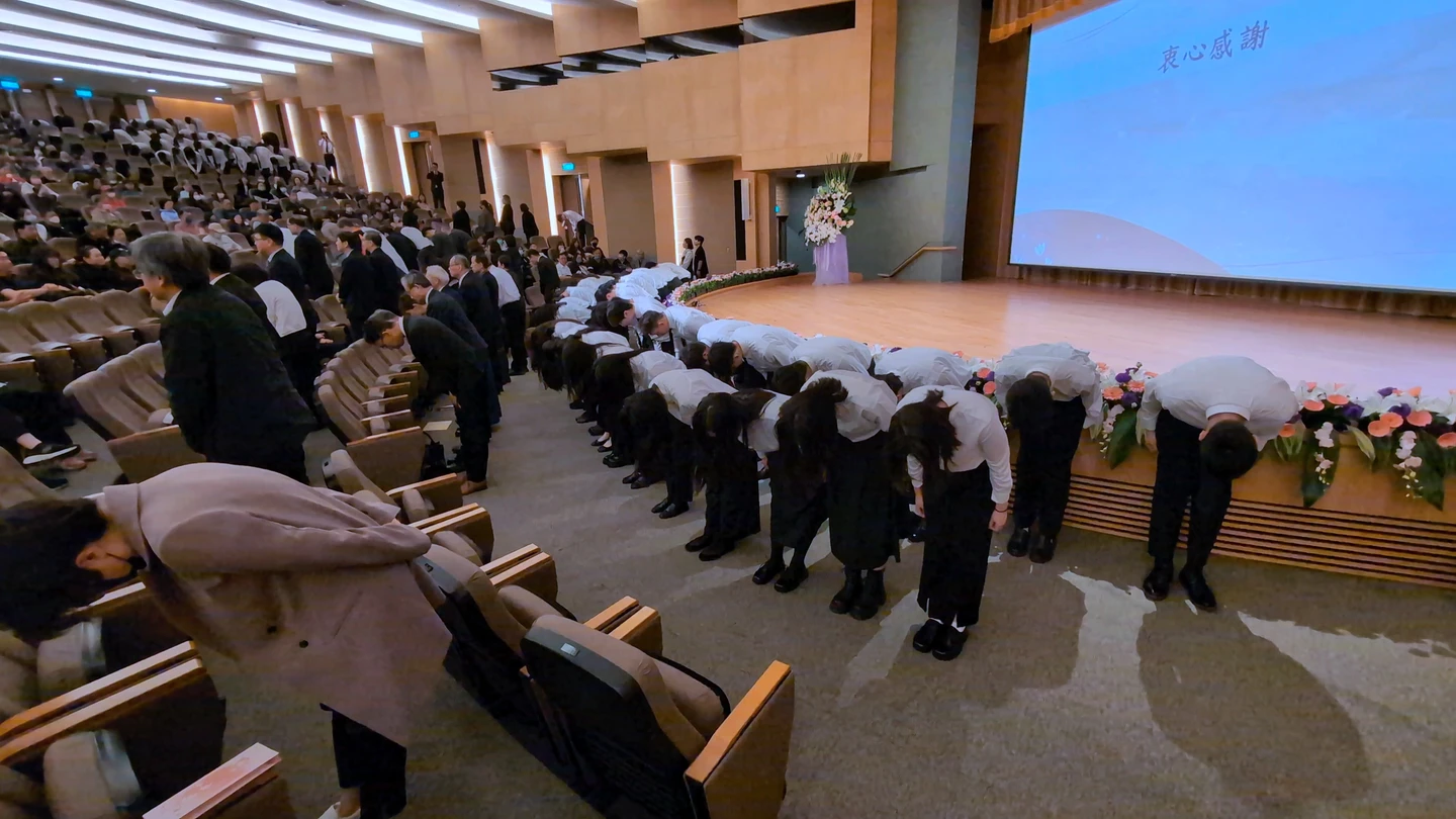 追思大會在長庚大學國際會議廳舉行,近千人參與,共緬懷57位器官捐贈者與14位大體老師。長庚大學校長湯明哲表示,這71位捐贈者各有不同的人生故事,但都在人生謝幕之際選擇回饋社會,將大愛遺留人間,並且引領醫學生學習醫學知能,體會生命可貴。