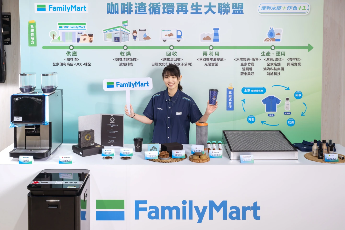 「咖啡渣循環再生大聯盟」為「全家」攜手鴻旭科技、鴻海科技集團、日翊文化物流、光隆實業、歐萊德、蔚來美好、興采實業、皇家竹炭、達鋼馨、味全、UCC及RE-THINK,跨界資源整合,將咖啡渣從廢棄物轉為提升經濟價值的綠色資源。