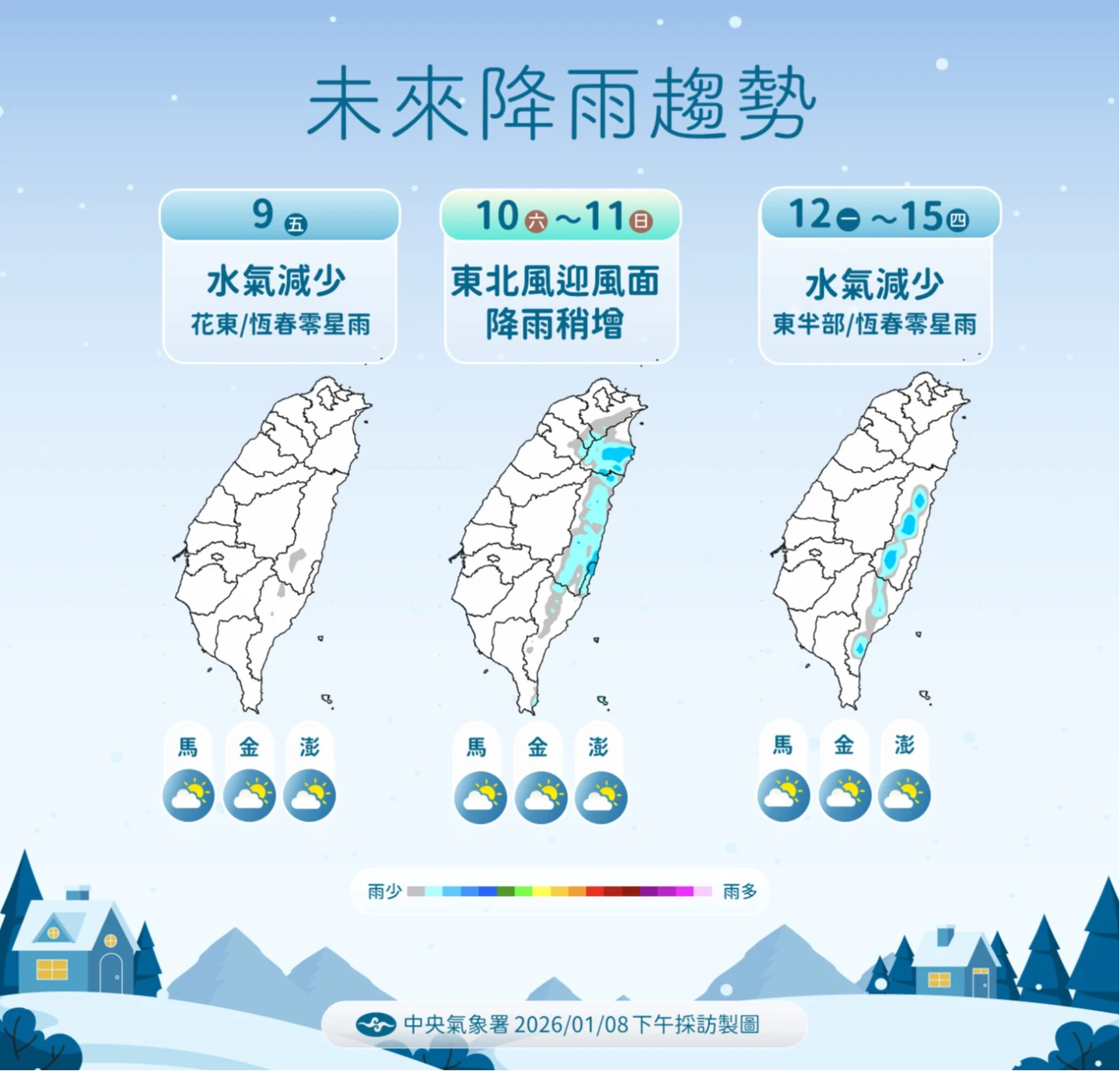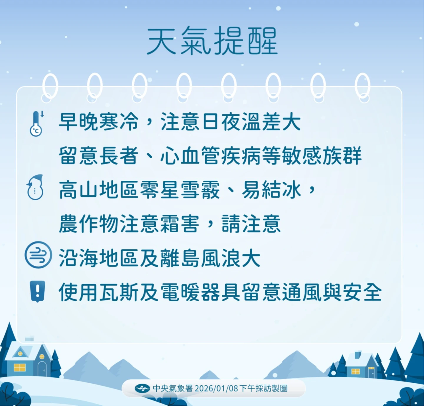 氣象署表示,今強烈大陸冷氣團雖稍減弱,但受強烈輻射冷卻效應影響,各地早晚氣溫仍明顯偏低,今日清晨西半部及宜蘭低溫普遍僅9至13°C,花東約14、15°C。白天起氣溫稍回升,北部及宜花高溫約16至18°C,中南部及台東可達20至23°C。