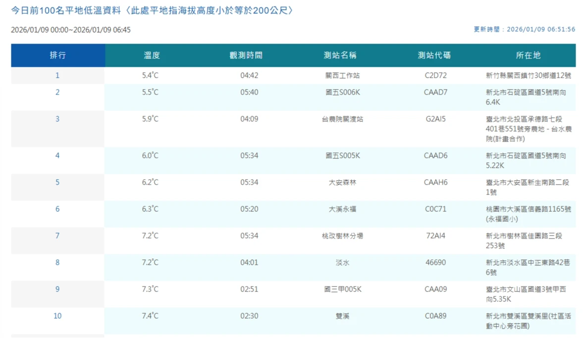 據氣象署資料顯示,今晨平地最低溫前10名以雙北居多,最低溫是新竹縣關西鎮5.4°C、其次是新北市石碇區5.5°C,北投5.9°C為第3名,大安森林公園也僅6.2°C。