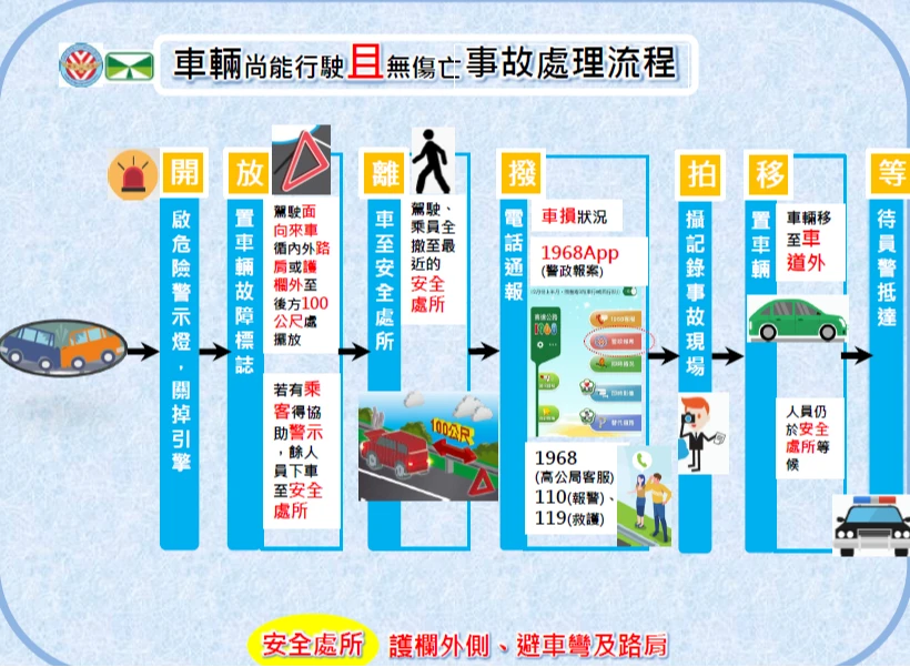 三、車輛於國道發生事故或故障時,若無人傷亡且車輛尚能行駛,請務必牢記「開、放、離、撥、拍、移、等」處理方式及流程,以預防二次事故,保障自身安全。