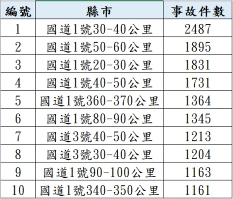 國道公路警察局統計,2025年國道因事故傷亡共造成76人死亡、6175人受傷。分析去年前十大肇事路段,分別是國道1號30至40公里(五股-泰山路段)肇事2487件,高居全年度第一肇事路段。國道1號50至60公里處(桃園-內壢路段)共有1895件列居第二。