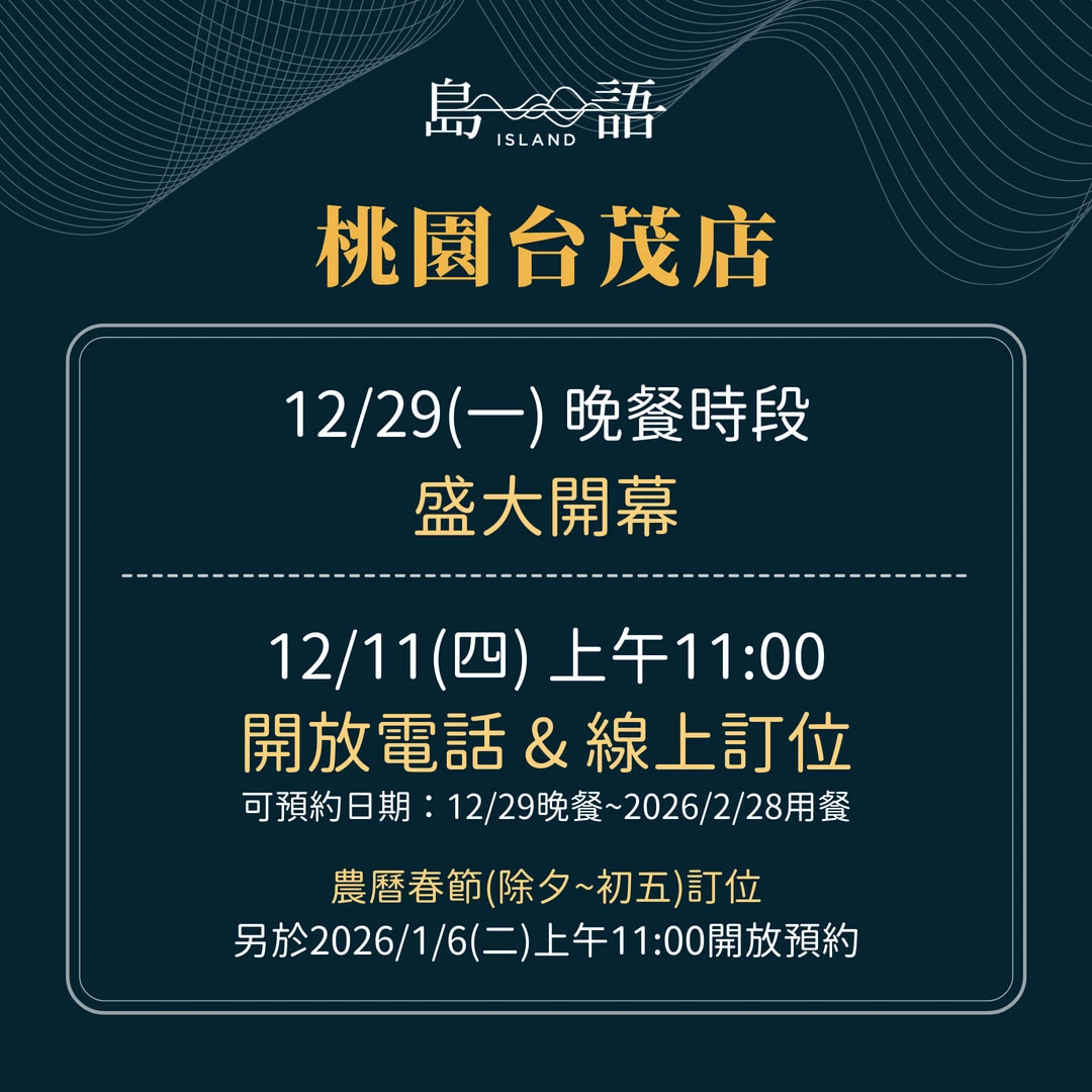 島語桃園台茂店12/29(一)晚餐時段正式開幕,今天上午11點開放電話&線上訂位,可預約12/29(一)晚餐~2026/2/28(六)期間用餐 (春節除夕~初五除外)。