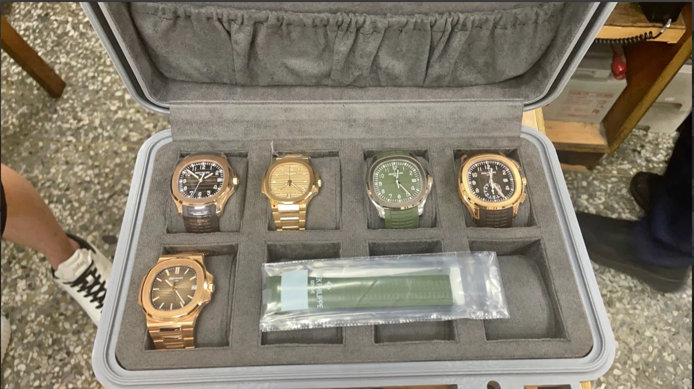 據了解,夫妻倆提著裝有5只百達翡麗名錶的行李箱赴會,包括二手價超過500萬的金鷹Nautilus 5711/1R-010以及熱門海底探險家Aquanaut系列,總市值粗估超過1800萬元。
