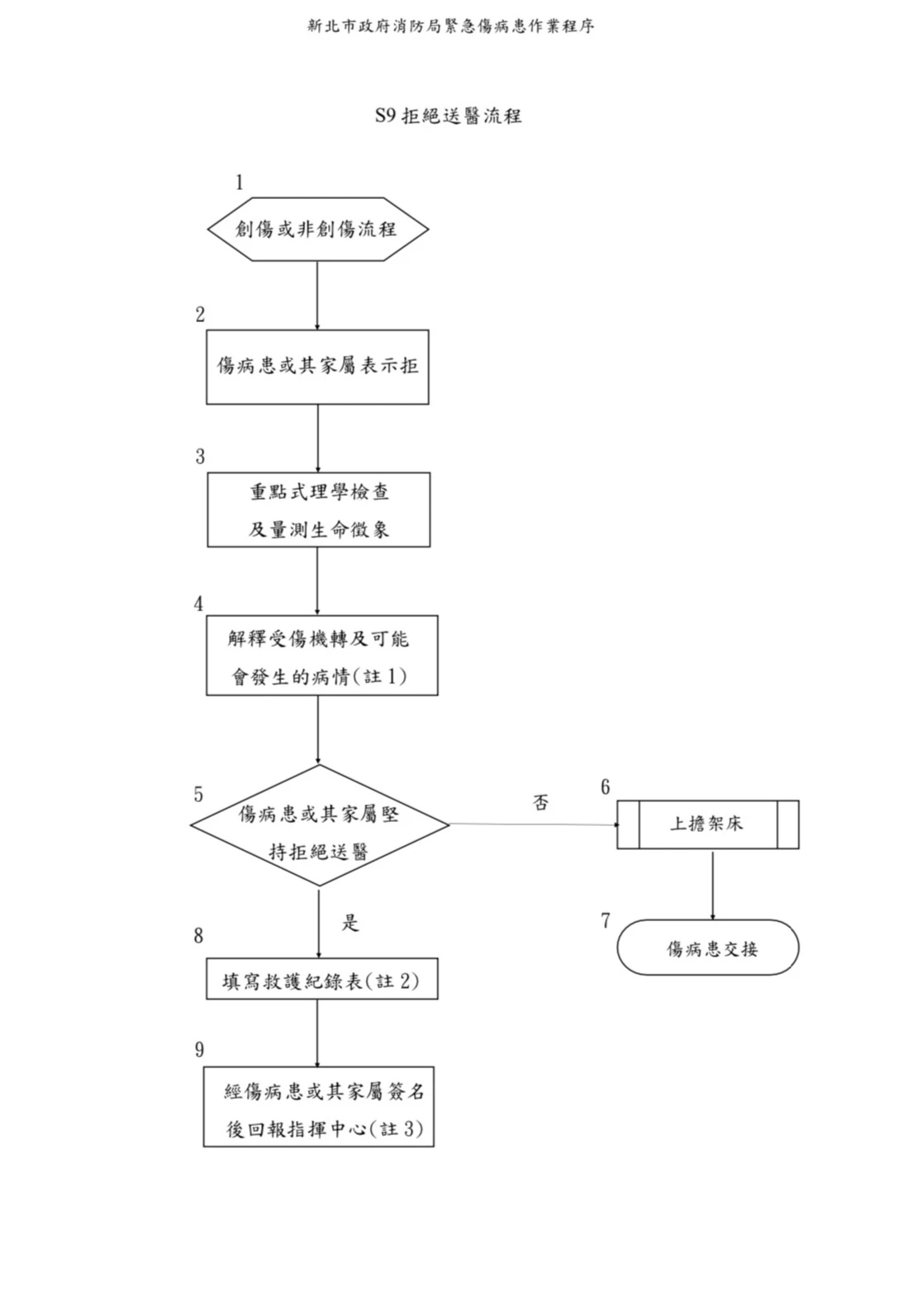 消防局說明,依據《新北市消防局緊急傷病患作業程序》拒絕送醫流程,核心原則是尊重傷病患自主意願,但需確保傷病患或其家屬了解潛在風險,並簽署書面文件,才算完成流程步驟。消防局解釋流程,包括初期「創傷及非創傷流程評估與救護」、「傷病患或其家屬表示拒絕」、再次「重點是理學檢查及量測生命徵象」,消防員向傷病患及其家屬解釋「受傷機轉及可能發生病情」,經「傷病或其家屬堅持拒絕送醫」,由救護員「填寫救護紀錄表」,經「傷病患或其家屬簽名」回報指揮中心,才算完成拒絕送醫流程。