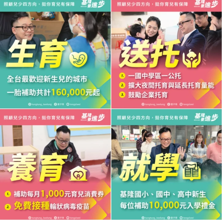 生育部分,第一胎6萬、第二胎8萬、第三胎10萬,結合中央10萬元,基隆新生兒補助16萬起跳,生育津貼全台最高。送托部分推動,一國中學區一公托,延長托育時段,擴大夜間與延托量能,並鼓勵企業托育,補助設施與人事費。