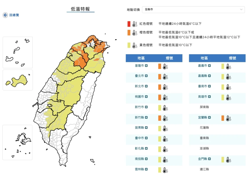 氣象署針對全台17縣市發布低溫特報,其中新北市、基隆市、臺北市、桃園市、新竹縣及宜蘭縣等6縣市為「橙色燈號」,有持續10度左右或以下氣溫發生的機率。另外,新竹市、苗栗縣、臺中市、彰化縣、南投縣、雲林縣、嘉義市、嘉義縣、臺南市、高雄市及金門縣等11縣市則為「黃色燈號」,亦需防範10度以下低溫。氣象署提醒,這波冷氣團在周三、周四(7日、8日)影響最鉅,中部以北及宜花地區整天偏冷,北部白天高溫僅約15、16度。