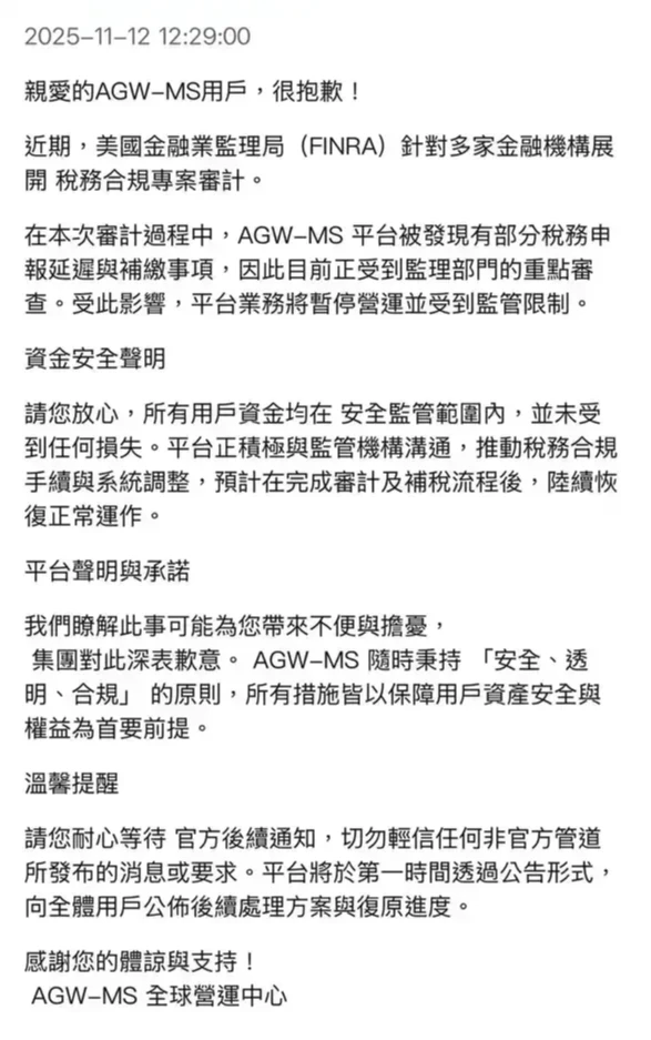 不過,「AGW-MS」全球營運中心11月12日發出公開信指稱,經美國金融監理局審計,業務平台被發現有稅務申報延遲等情況,因此將暫停營運。