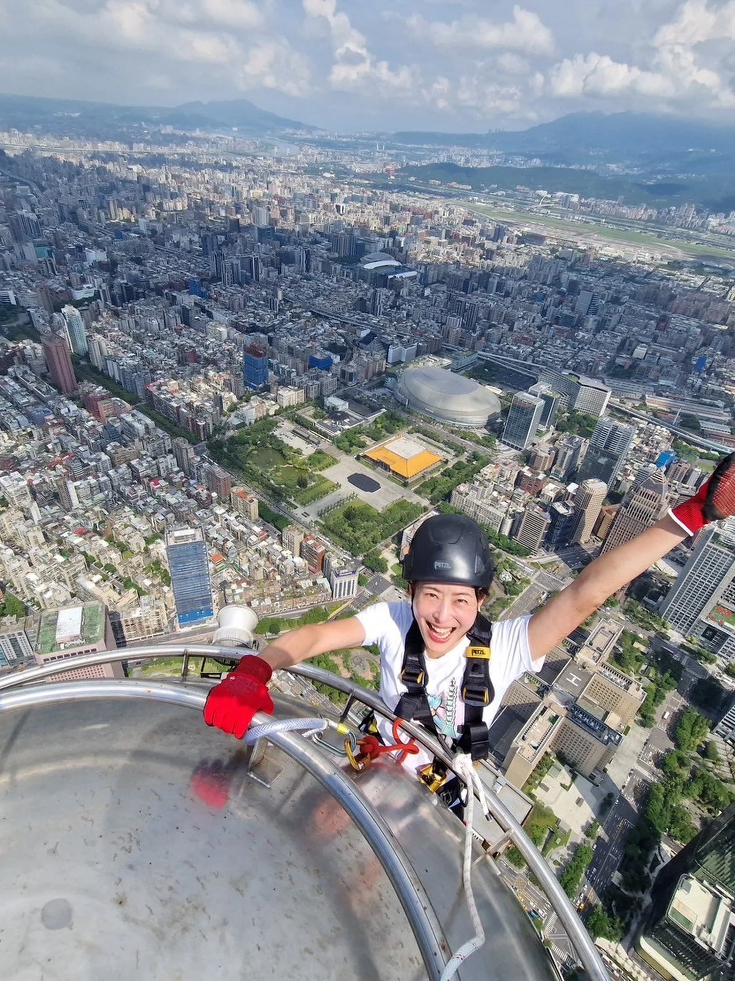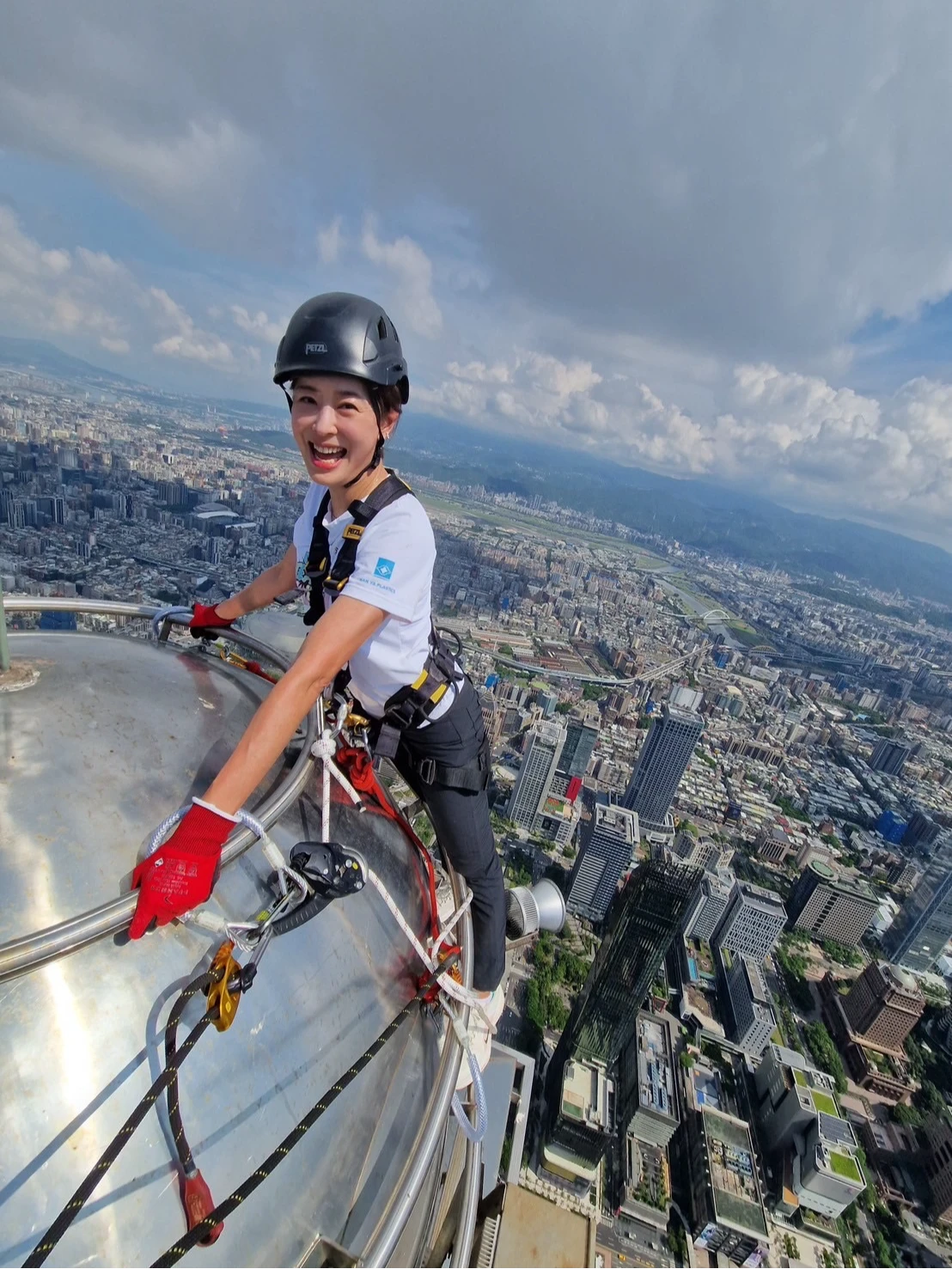 賈永婕親自攀登上101頂端圓球,坦言已經腿軟,還說自己有「瘋子般的勇氣」,因為只能站一條鋼圈,「但是我就是有勇氣站上去接受挑戰!Team 101 My team讓我們一起完成這個不可能的任務!」