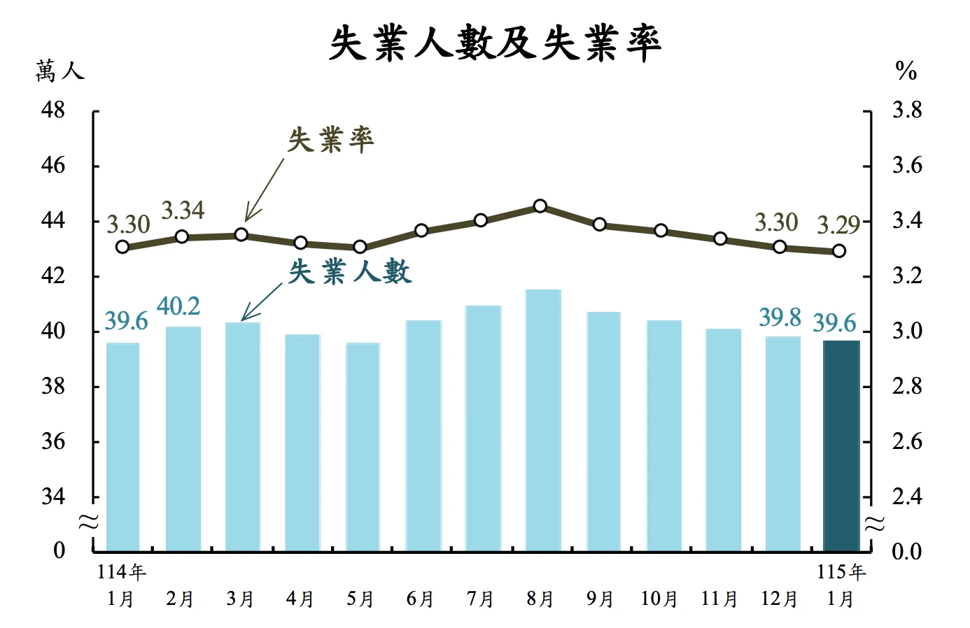 【記者王良博/台北報導】主計總處今(25)日公布,1月失業人數39.6萬人,較上月減少2000人,失業率則為3.29%,失業率已連5個月下降。