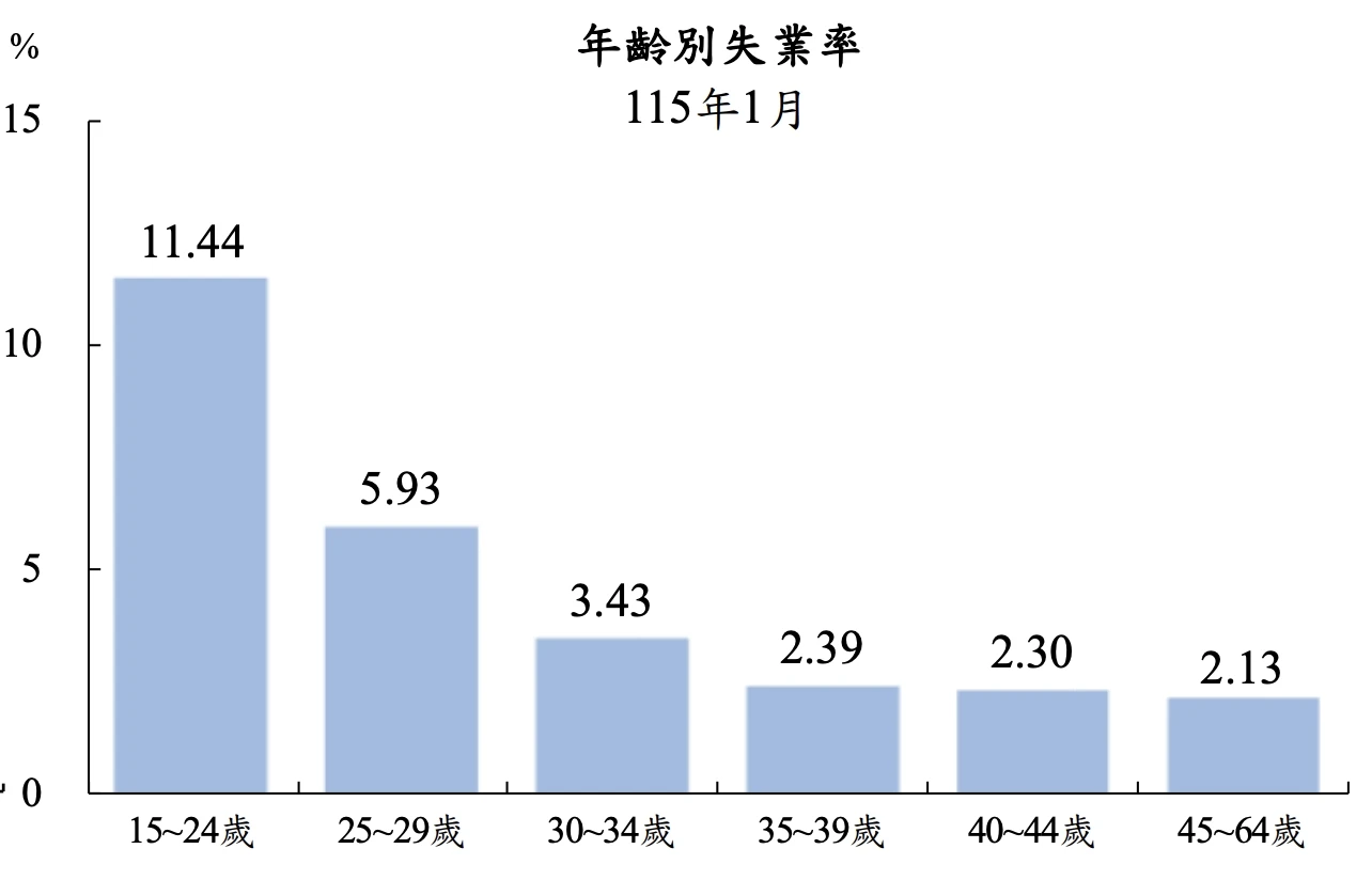 進一步從教育程度別觀察,以大學程度者失業率 4.47%最高,高中、高職及研究所程度者分別為2.99%及2.89%。按年齡層觀察,15至24歲者失業率11.44%,多為初次尋職,處職場調適階段,因此失業率較高,25至29歲者失業率為5.93%,30至34歲者為3.43%。