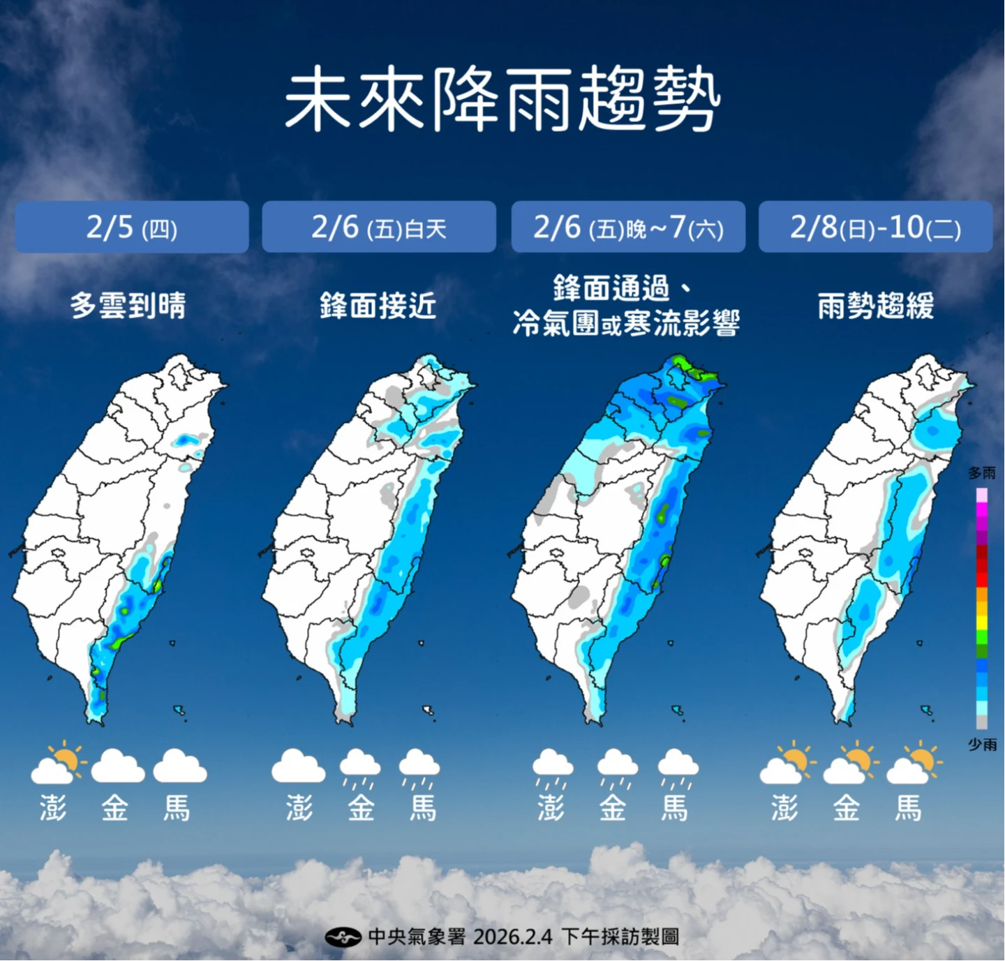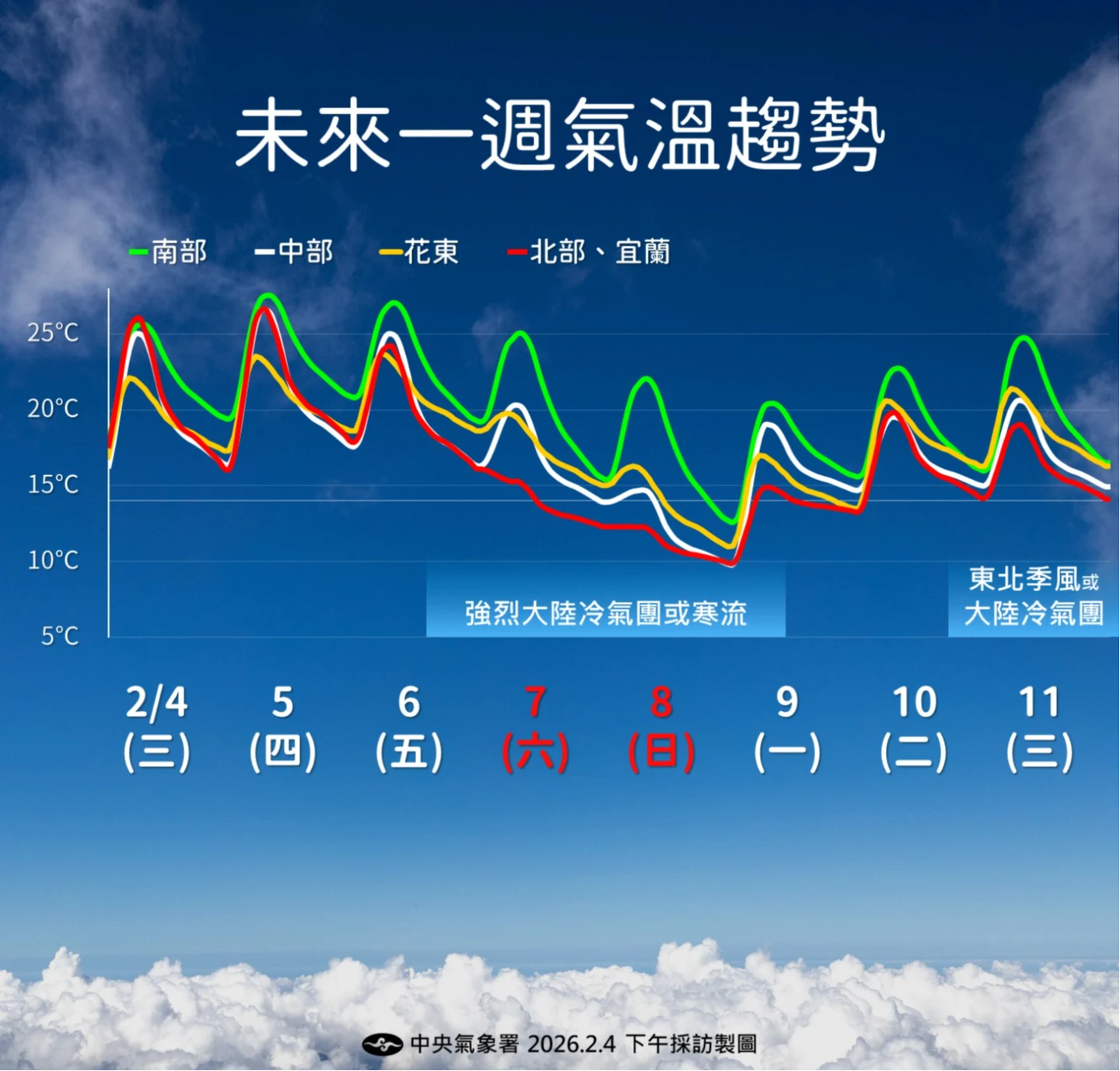 明晚起至周六(7日),隨著鋒面通過及強烈大陸冷氣團(或寒流)南下,中部以北及宜花天氣明顯轉冷,北部及宜蘭地區將出現廣泛降雨,中部及南部山區也有零星短暫雨。北部及宜花地區白天起明顯轉冷,其餘地區入夜後也會感受寒意。