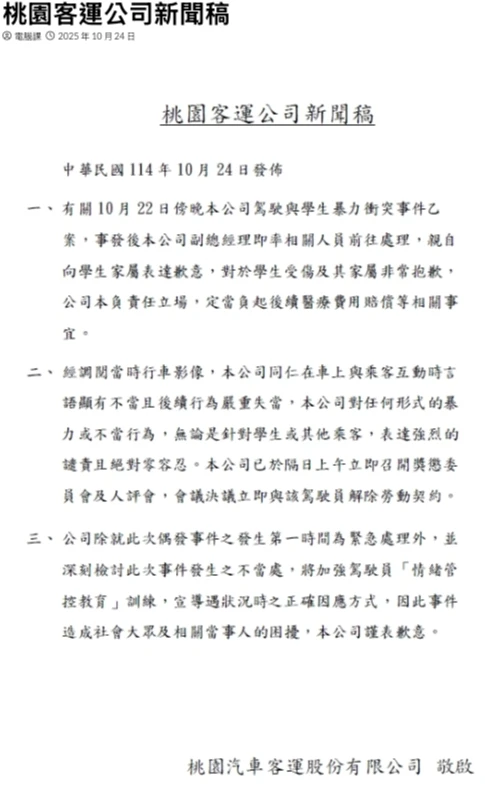 二、經調閱當時行車影像,本公司同仁在車上與乘客互動時言語顯有不當且後續行為嚴重失當,本公司對任何形式的暴力或不當行為,無論是針對學生或其他乘客,表達強烈的譴責且絕對零容忍。本公司已於隔日上午立即召開獎懲委員會及人評會,會議決議立即與該駕駛員解除勞動契約。