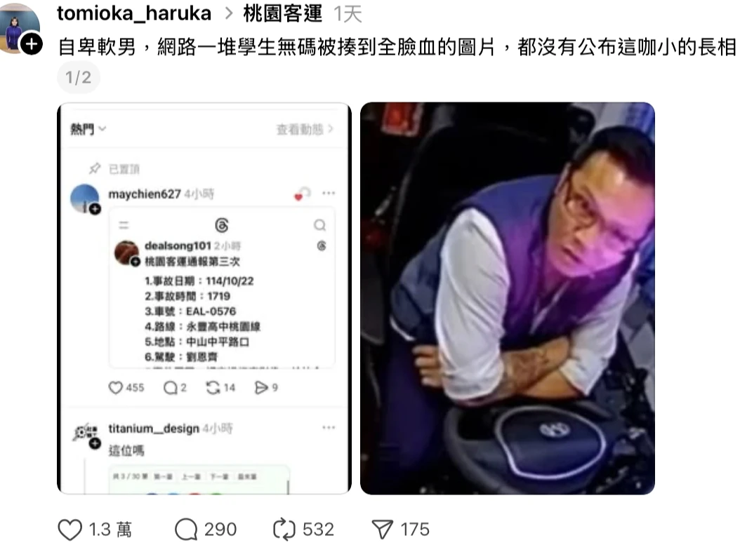 【記者陳力維/綜合報導】桃園客運一名劉姓司機於22日傍晚,因懷疑高中生投幣不足引發口角,後續有同校學生仗義執言,劉姓司機竟情緒失控棄車當街狂毆學生,導致該生滿臉鼻血、鼻樑骨折,暴力畫面曝光後引發民眾震驚、強烈撻伐。警方事後將劉姓司機依傷害罪移送法辦,桃園地檢署複訊後,諭知以2萬元交保候傳。