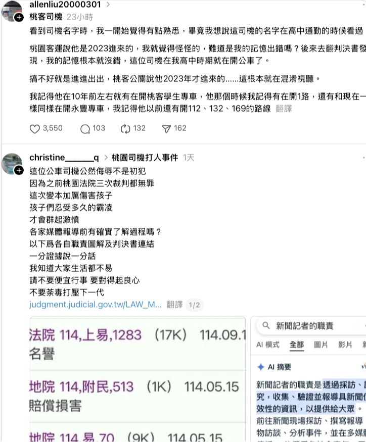 隨著事件延燒,網路社群上湧現大量網友爆料,揭露劉姓司機的「驚人黑歷史」,並質疑桃園客運說法與事實不符。多名網友在Threads等社群平台發文表示,劉姓司機早在10年前左右就曾駕駛桃園客運的學生專車,且當時就有辱罵乘客的情況,質疑其應為「回任」司機,公司稱其短期任職的說法是在混淆視聽。