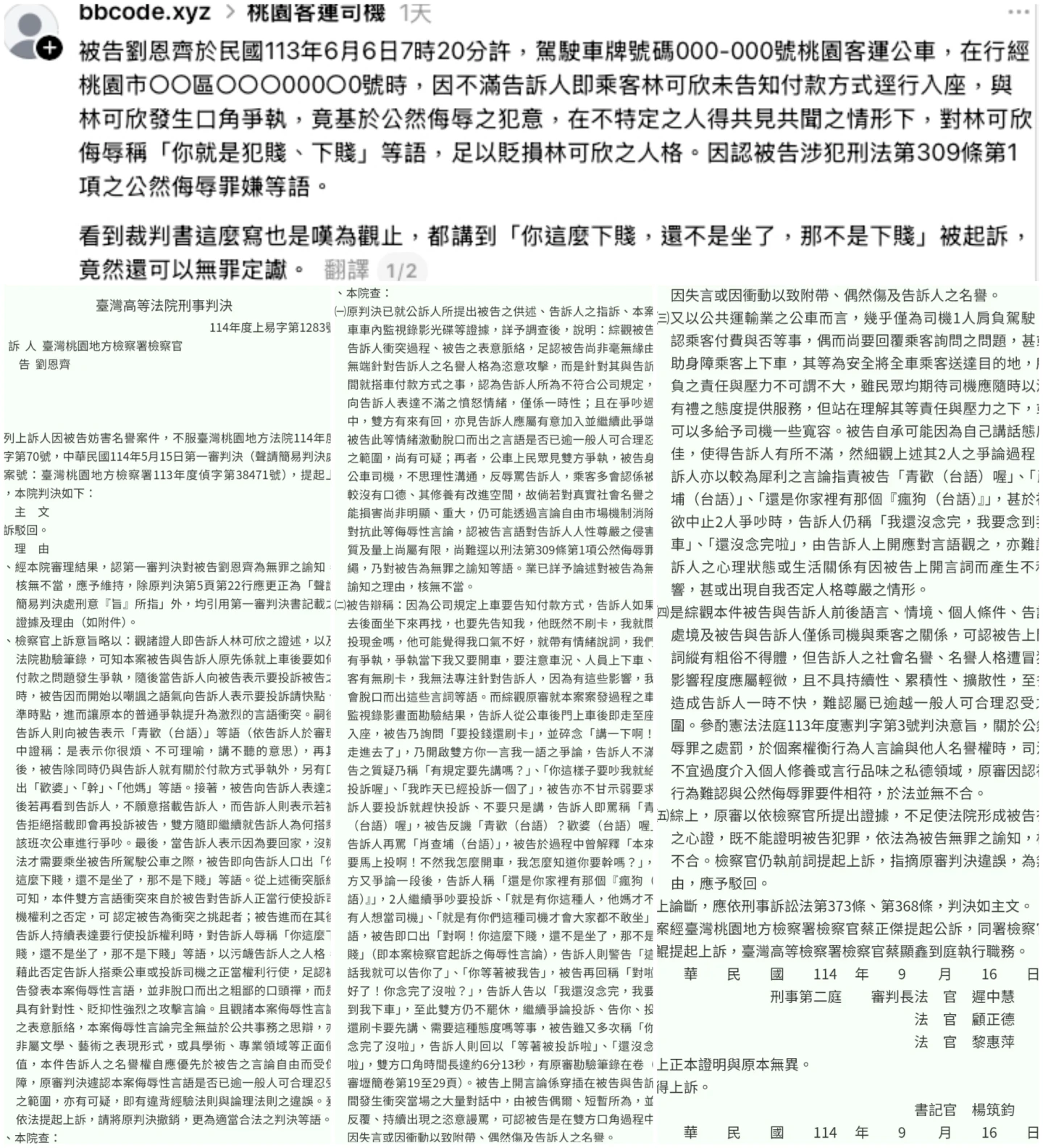 更有網友翻出疑似同一名司機的判決書,內容顯示他曾於2024年(資料顯示為去年)因不滿女乘客未先告知付款方式就入座,與對方爆發爭執,情緒失控脫口辱罵「你就是犯賤、下賤」等侮辱性字眼而遭提告公然侮辱罪。雖然法院最終判決劉姓司機無罪,但網友質疑其情緒控管能力顯然有嚴重問題,並非首次對乘客口出惡言。