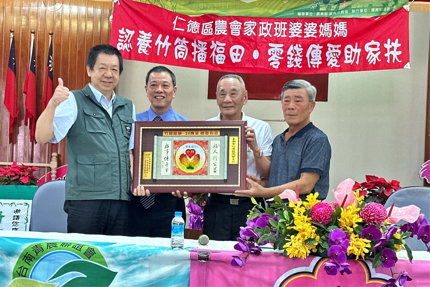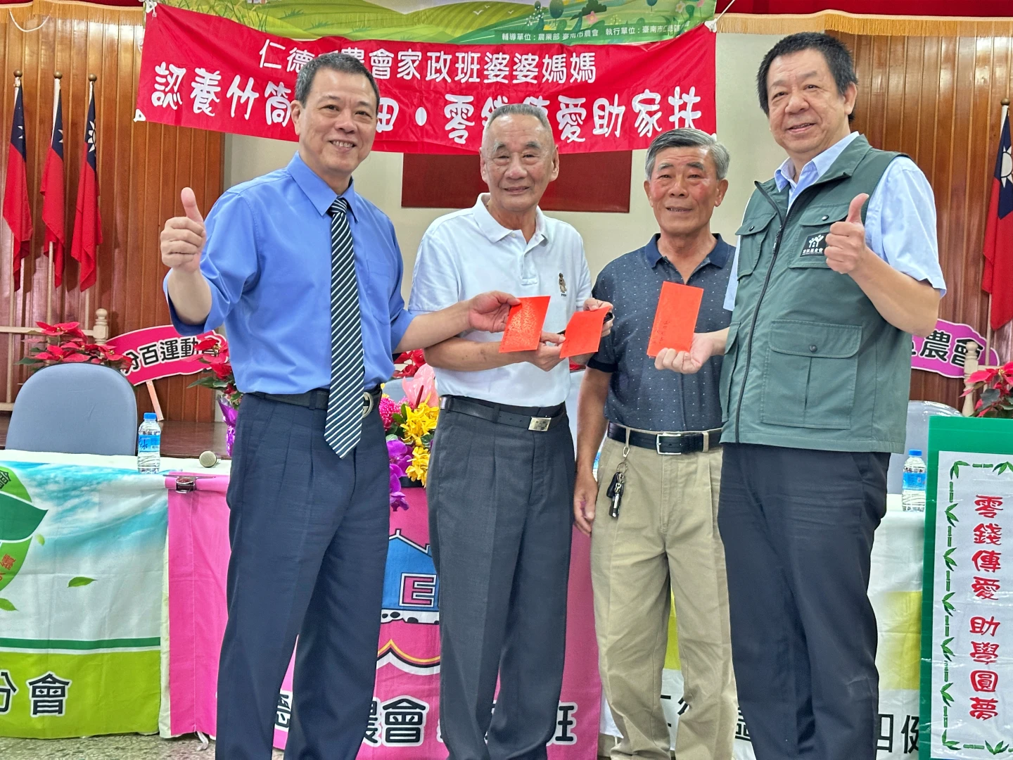 台南市仁德區農會今天在農會3樓舉辦「幸福農村計畫推廣教育三部門聯合成果展暨愛心竹筒回娘家」活動,歡慶創會100週年,25位總齡1759歲的阿公阿嬤「千歲團」帶來開場舞蹈展現活力,同時揭開農會與北台南家扶中心共同攜手20年的感人序幕。