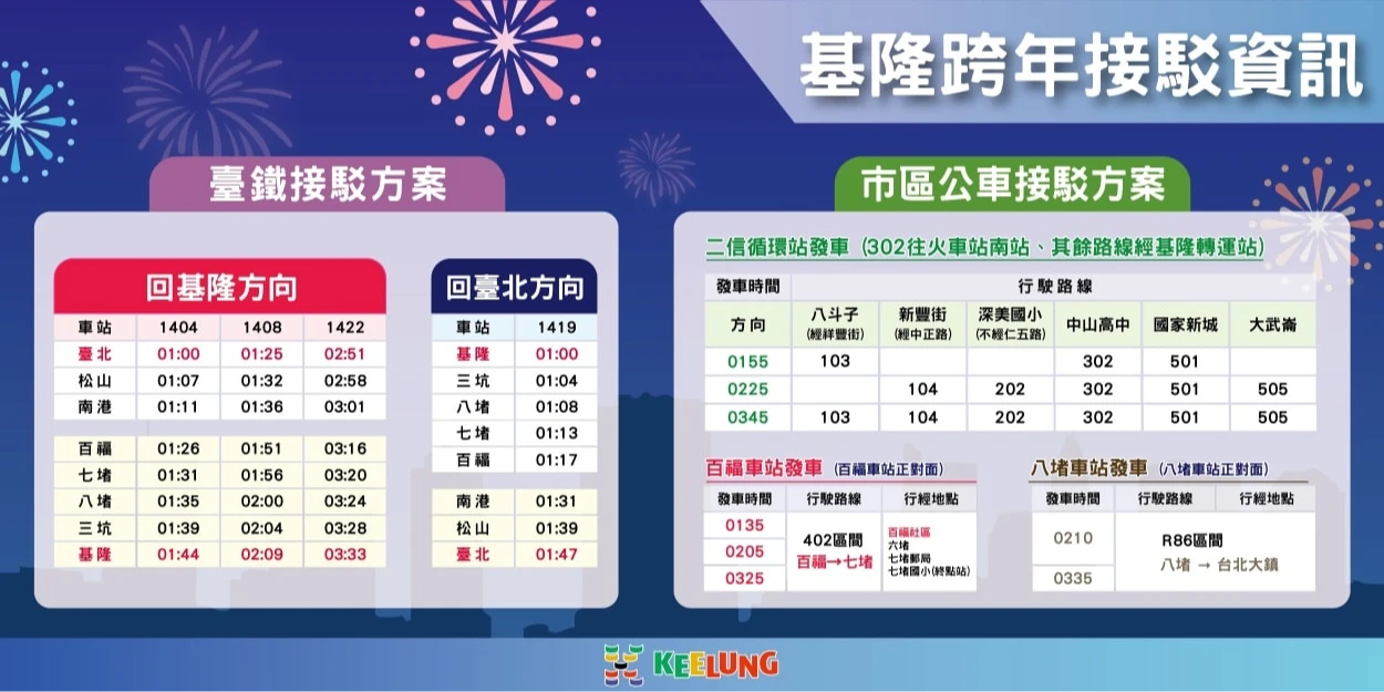 針對居住在百福社區、六堵、七堵及暖暖區的居民,市府也安排了周密的配套。公車處特別加開402區間車(終點七堵國小)及 R86 區間車,分別從百福火車站與八堵火車站接駁發車。透過火車與區間公車的無縫對接,完善跨年夜公共運輸的最後一哩路,確保基隆市民都能平安、愉快地開啟新的一年。