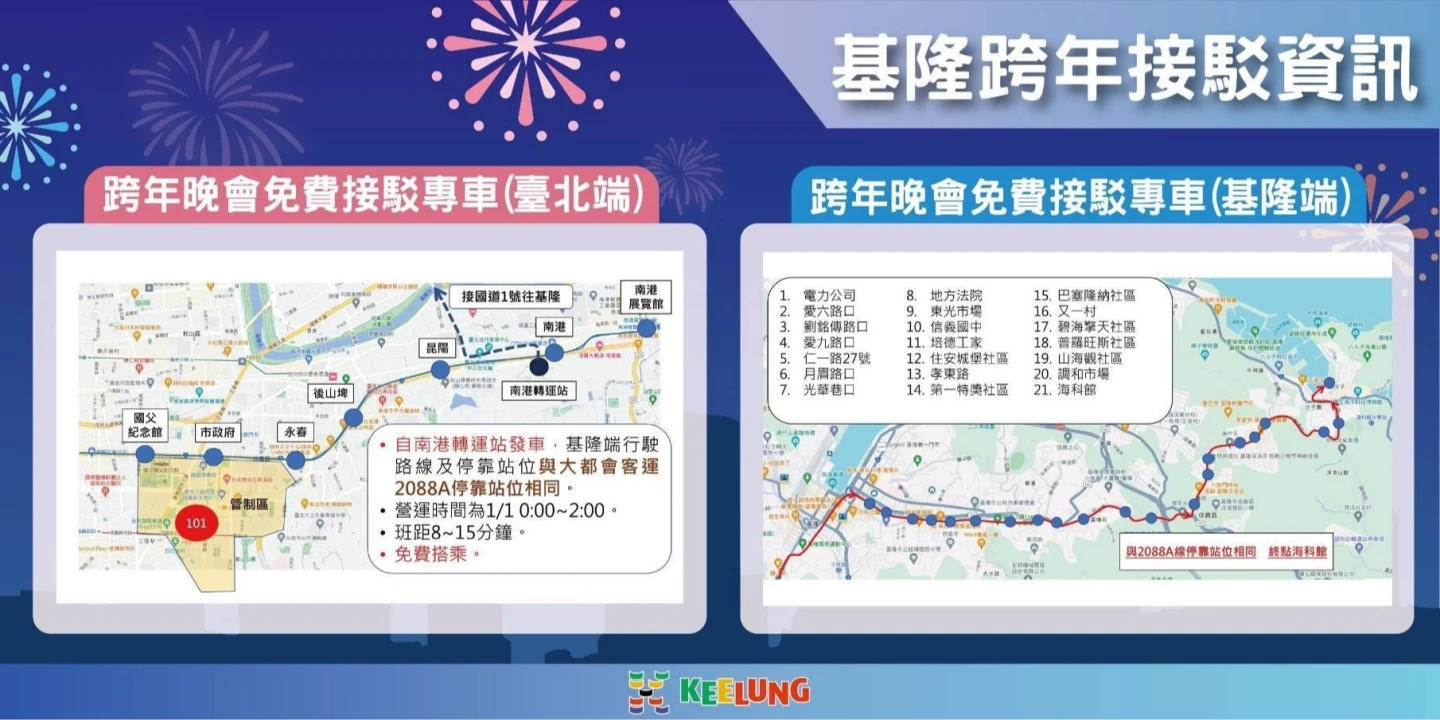 【記者陳力維/綜合報導】台北跨年晚會倒數計時,針對基隆市民的返家需求,基隆市政府宣布推出貼心措施。12月31日晚會結束後,基隆市府將安排「免費接駁專車」,自明年1月1日凌晨0時至 2 時發車,由南港轉運站西站發車,路線比照2088A沿途停靠各站點,直達基隆海科館,讓狂歡後的基隆民眾不必擔心深夜交通問題。