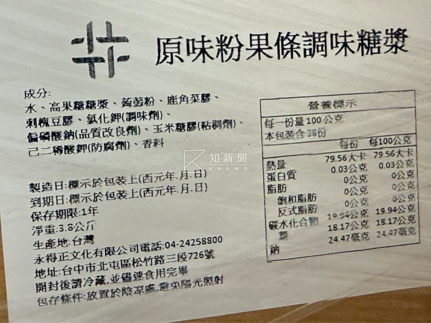 記者追查發現,其中原味粉果條調味糖漿明確標示保存方式為「置放於陰涼處,避免陽光照射」;台糖塑膠桶裝的甘蔗液糖也明確寫著「避免直接日照」,卻都放在半露天停車場,除了環境處於高溫,也難擋雨天,有時地面還濕漉漉。