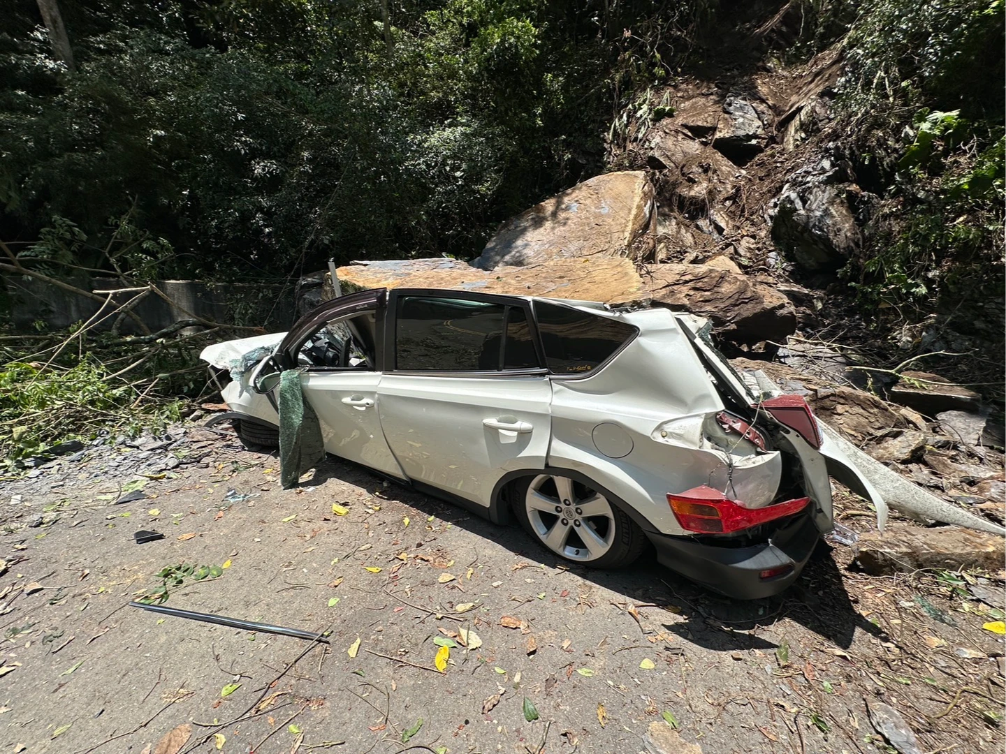 新北烏來傳落石坍落!休旅車壓成廢鐵 駕駛釣魚逃死劫