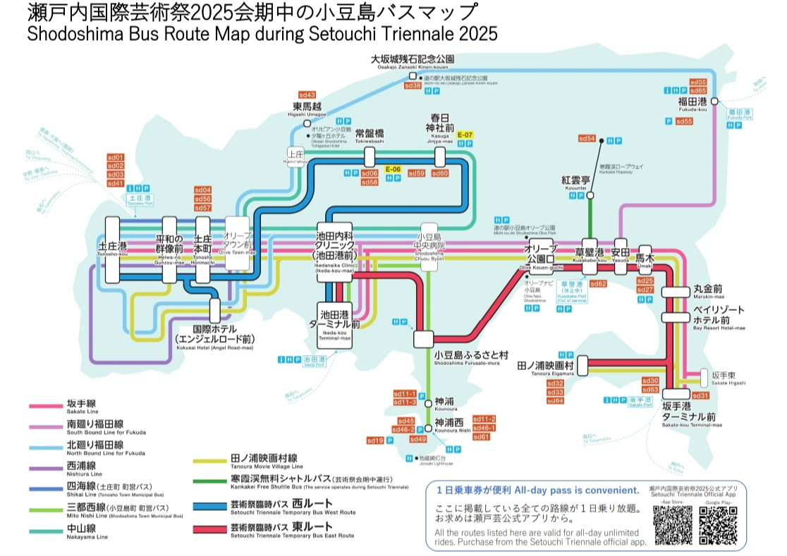 瀨戶內國際術祭官網提供小豆島公共運輸,在今年藝術季期間,設有公車往來,還有一日乘車券,可下載APP掌握班次。