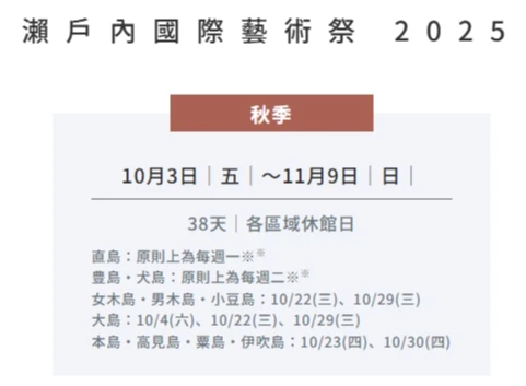 以瀨戶內群島為舞台,每3年舉辦一次的現代藝術祭典。2010年首次舉辦,為期約100天的展期分為春、夏、秋3個季節,可體驗瀨戶內在各個季節的魅力。展期中吸引了來自日本國內外約100萬名遊客造訪,是日本具有代表性的國際藝術節。