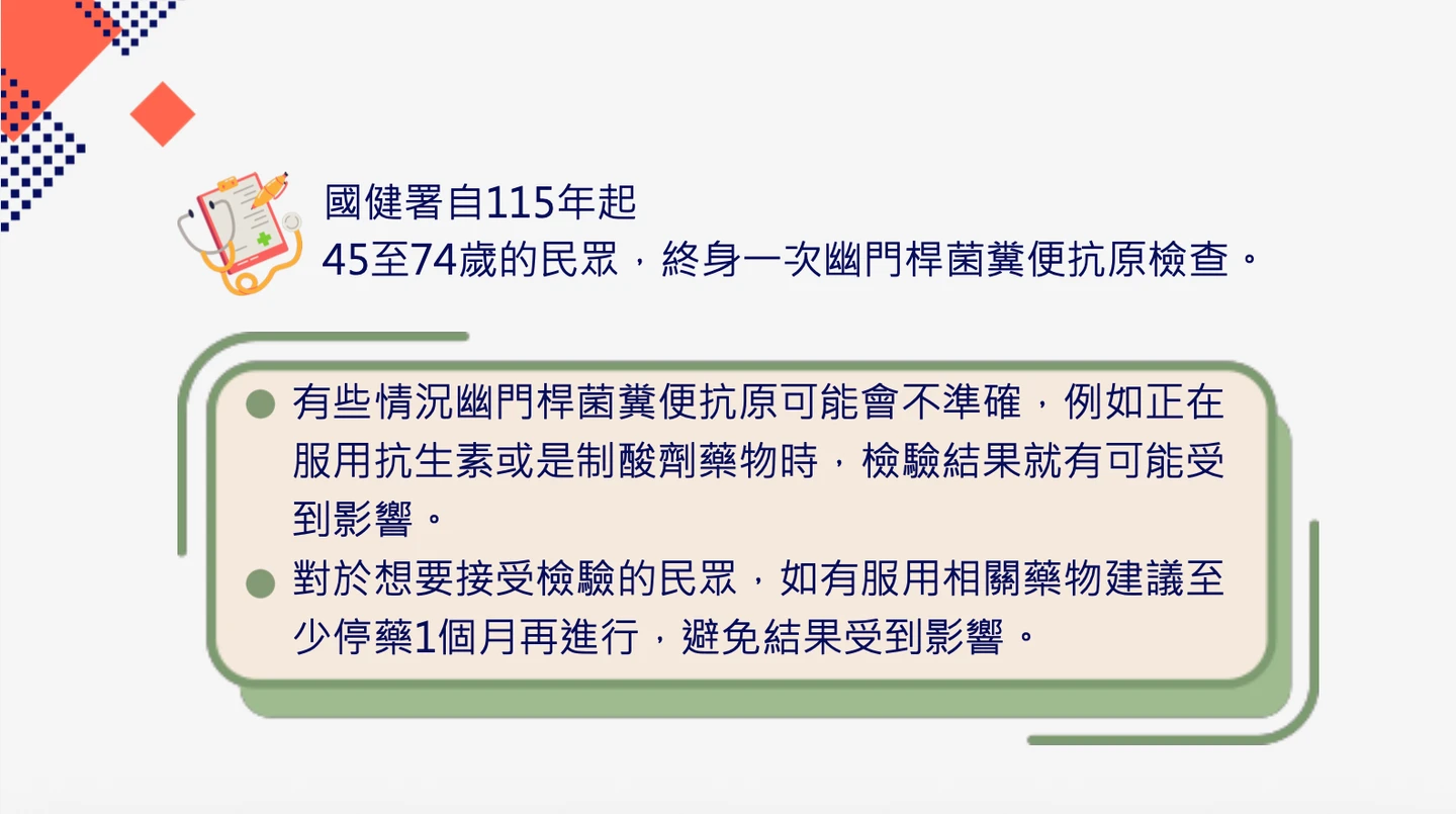 康本初說,國健署自今(2026)年起,開始提供45至74歲的民眾,終身一次幽門桿菌糞便抗原檢查,檢測有無幽門桿菌感染。不符合公費篩檢身分者,若有長期胃部不適、患有胃炎、胃潰瘍者、有胃癌家族史者、同住家人中有人確認感染幽門桿菌者,也建議進行檢驗。