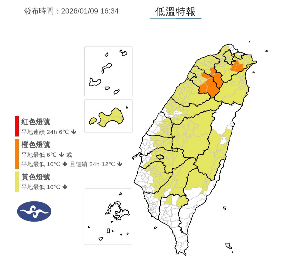 低溫橙色(非常寒冷)燈號地區為新北市、桃園市、新竹縣;黃色(寒冷)燈號為基隆市、台北市、新竹市、苗栗縣、台中市、彰化縣、南投縣、雲林縣、嘉義市、嘉義縣、台南市、高雄市、屏東縣、宜蘭縣、花蓮縣、台東縣、金門縣,留意10度以下氣溫。