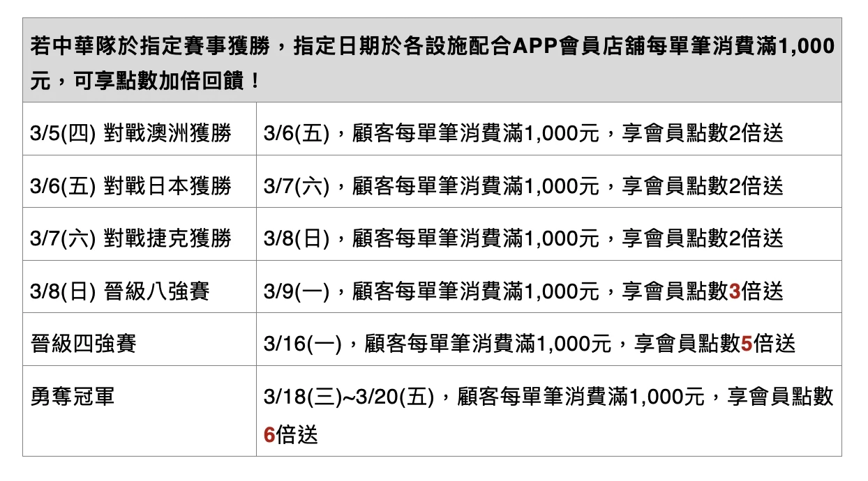 MITSUI OUTLET PARK、Mitsui Shopping Park LaLaport所有據點3/5~3/17經典賽期間限定,凡是新加入 APP 會員的顧客,即可獲得50元電子抵用券乙張(各設施數量有限,贈完為止)。不只如此,若中華隊在指定賽事取得勝利,將同步推出會員點數加倍送回饋,例如3/5對戰澳洲獲勝,3/6顧客每單筆消費滿1,000元,享會員點數2倍送;勇奪冠軍3/18~3/20每單筆消費滿1,000元,享會員點數6倍送。