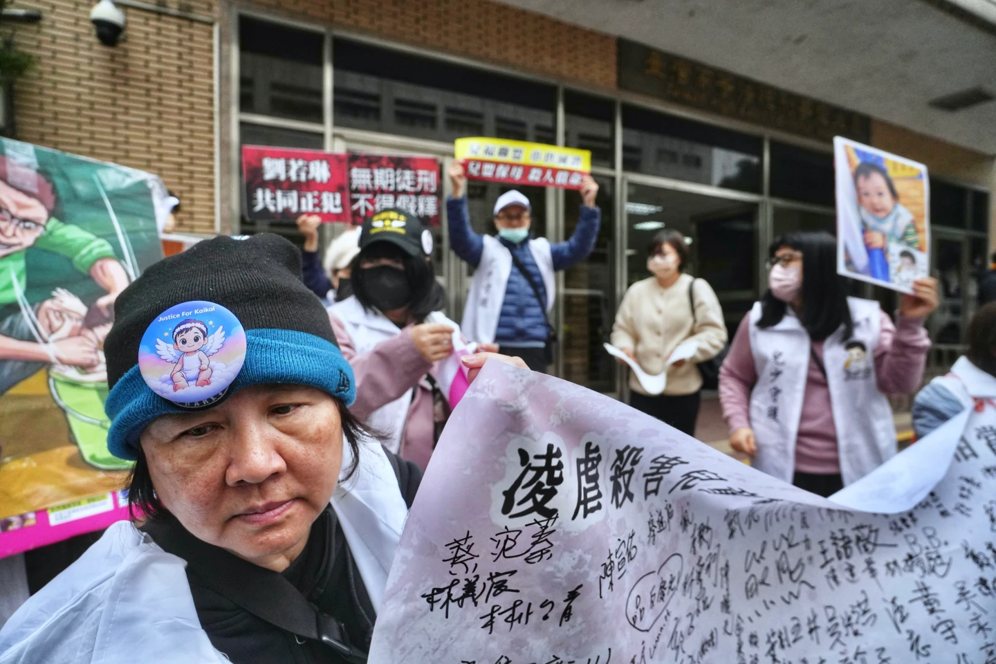 今天上午近9時,剴剴戰士們集結在高院外,高聲怒喊「重判惡魔保母、殺人償命」等口號,並高舉蓋著血手印、寫著「凌虐殺害兒童終身不得假釋」的連署白布條,希望法院重判劉彩萱姊妹。