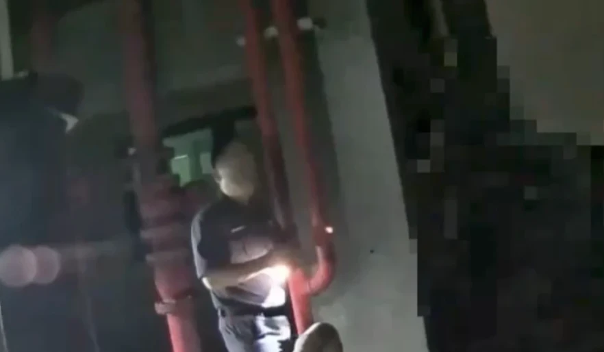 陳女胞姊驚慌衝入派出所求救:「我妹妹被挾持,還在我家地下停車場!」警方見她滿身血,趕緊派員直奔現場,並協助胞姊就醫,隨後發現蘇男挾持陳女到頂樓,趕緊上樓勸阻,但蘇男情緒激動,始終不放人,和警方對峙近1小時,直到晚間9時47分,蘇男突持刀朝前女友脖子劃了一刀,自己則墜落地面,送醫不治。