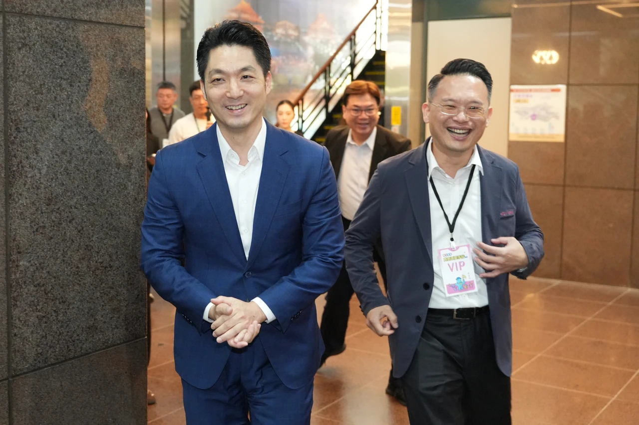 當媒體追問,是否覺得自己是黨內除了鄭麗文、盧秀燕之外「第三顆太陽」?蔣萬安一開始聽完似乎略顯慌張,先是轉頭看向一旁的蘇俊賓、劉和然,並笑喊「副市長們!」