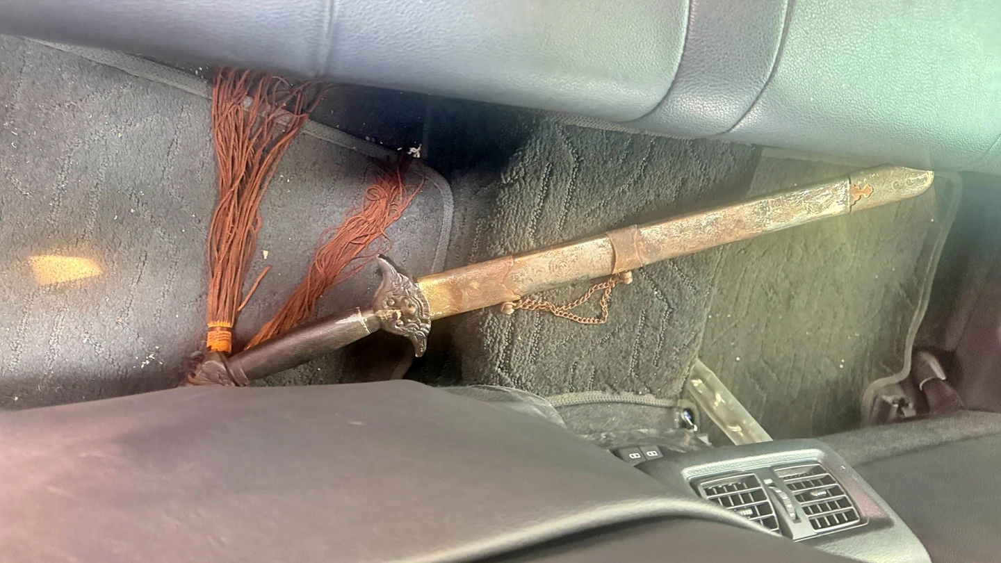 警方獲報後迅速出動警網趕赴校園,擴大搜尋在附近路段找到男子出沒,隨即展開強勢作為,迅速上前將其制伏,同時起出這把未開封的神明寶劍。
