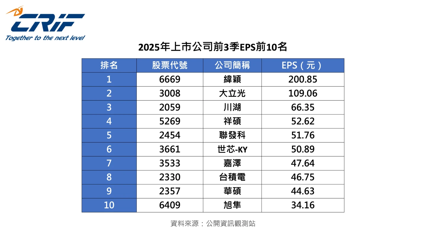 EPS第7至第10名依序為嘉澤的47.64元、台積電的46.75元、華碩的44.63元,以及旭隼的34.16元。整體觀察,前10名中除大立光之外,其餘均為AI相關股。